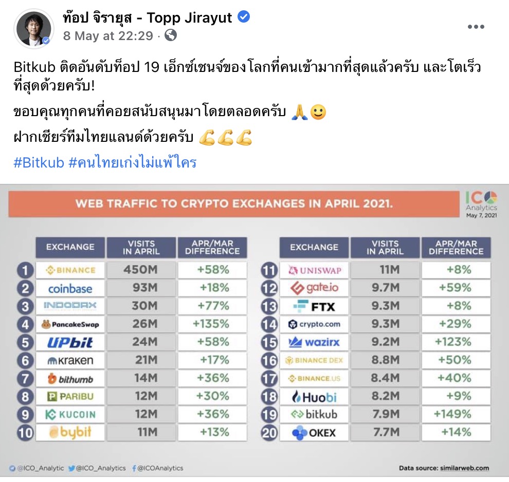 ล่าสุดมีรายงานว่า Bitkub ติดอันดับท็อป 19 ของวงการ Cryptocurrency Exchange ของโลกเป็นที่เรียบร้อยแล้วซึ่งถือว่ามีการเติบโตขึ้นอย่างรวดเร็ว