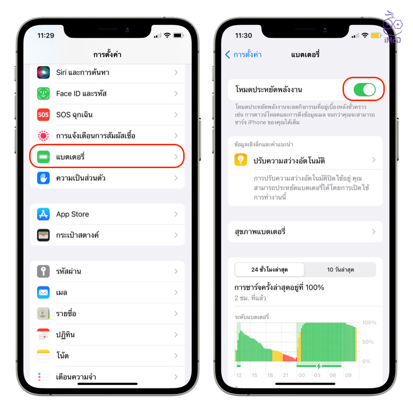 สามารถเปิดใช้งานได้ที่ การตั้งค่า (Settings) > แบตเตอรี่ (Battery) > เปิด โหมดประหยัดพลังงาน (Low Power Mode)