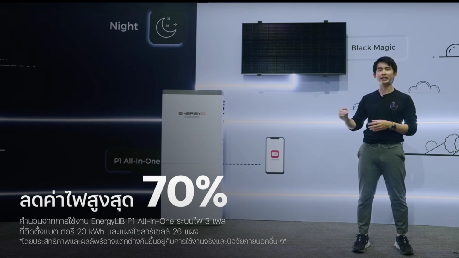 แบรนด์โซล่าเซลล์อีกหนึ่งตัวเลือก ที่สามารถผลิตไฟได้มากกว่า และทดสอบแล้วว่าสามารถลดค่าไฟบ้านได้มากสุดถึง 70%* กับ EnergyLIB P1 All-in-One ผลิตภัณฑ์ที่ไม่เหมือนใคร ด้วยจุดเด่น All-in-One Solution “โซลูชันแบบครบวงจร” ผลิตทั้งแผงโซล่าเซลล์, Inverter, ระบบ Battery Management System (BMS) เองทั้งหมด แถมมาพร้อมดีไซน์ที่สวยงามทันสมัย ในราคาที่เข้าถึงได้ง่ายขึ้น