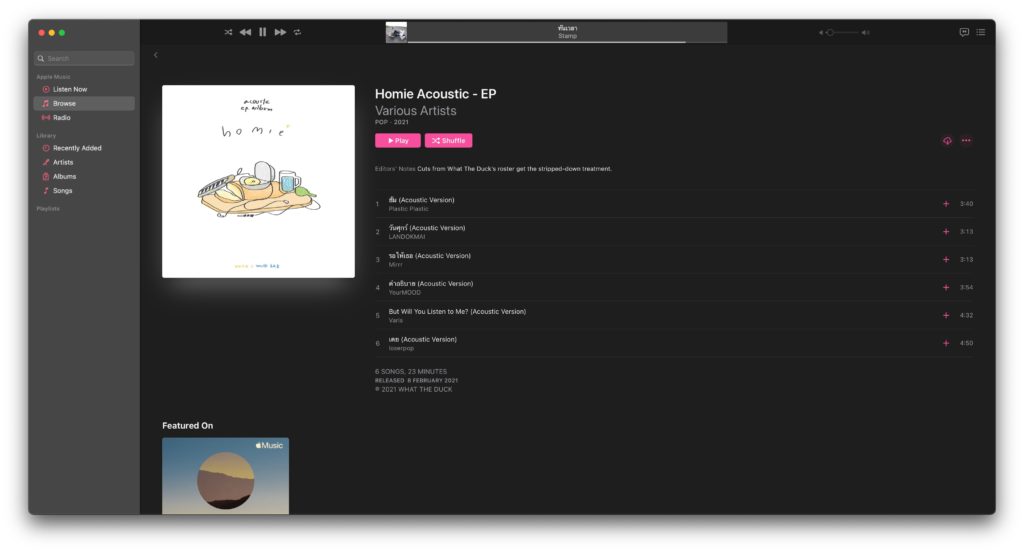 ถึงแม้ Covid-19 อาจทำให้เราต้องอยู่ห่าง ๆ อย่างห่วง ๆ วันนี้ Apple Music ชวนทุกคนมาคลายเหงา ใกล้ชิดกับเหล่าศิลปินจากค่ายเพลง What The Duck กับ Home Acoustic EP พบกับผลงานเอ็กซ์คลูซีฟ Acoustic EP จาก Mirrr, Plastic Plastic, Landokmai, Losepop, Varis และ YourMOOD