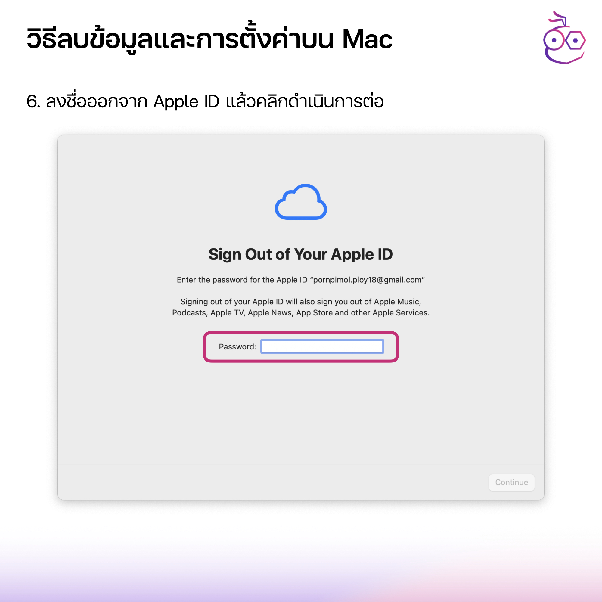 5. ลงชื่อออกจาก Apple ID แล้วคลิกดำเนินการต่อ