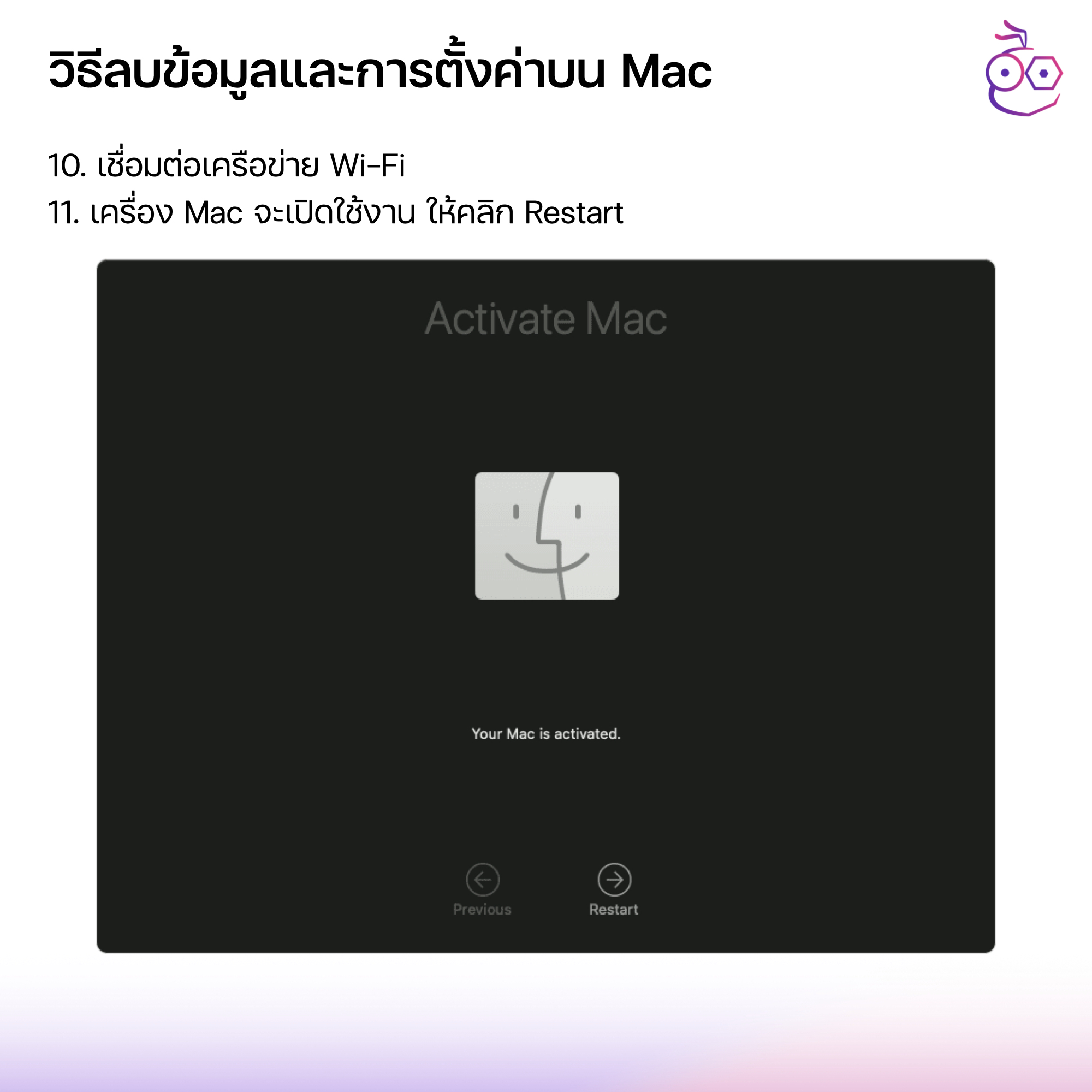 10. เครื่อง Mac จะเปิดใช้งาน ให้คลิก Restart