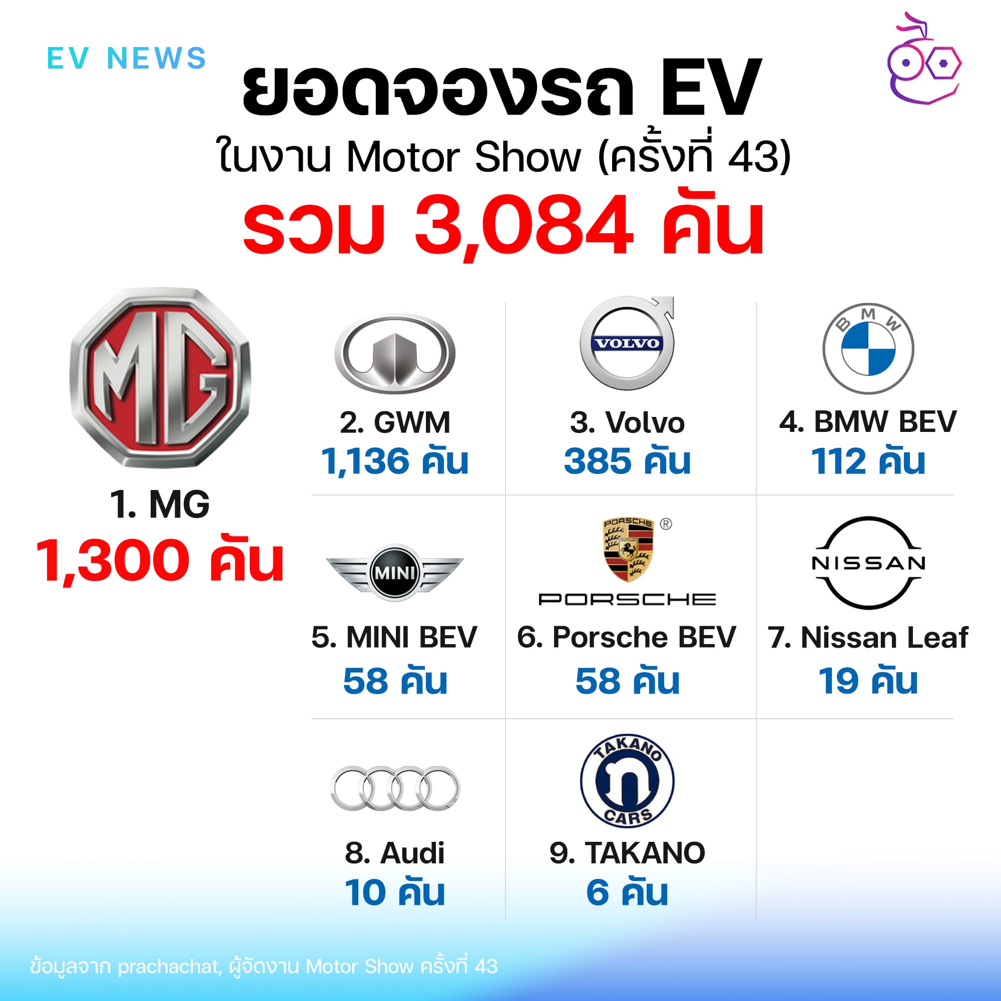 ประชาชาติธุรกิจ รายงานข้อมูลอ้างอิงจากผู้จัดงาน Bangkok International Motor Show ครั้งที่ 43 (2022) เผยลำดับยอดจองรถ EV ดังนี้