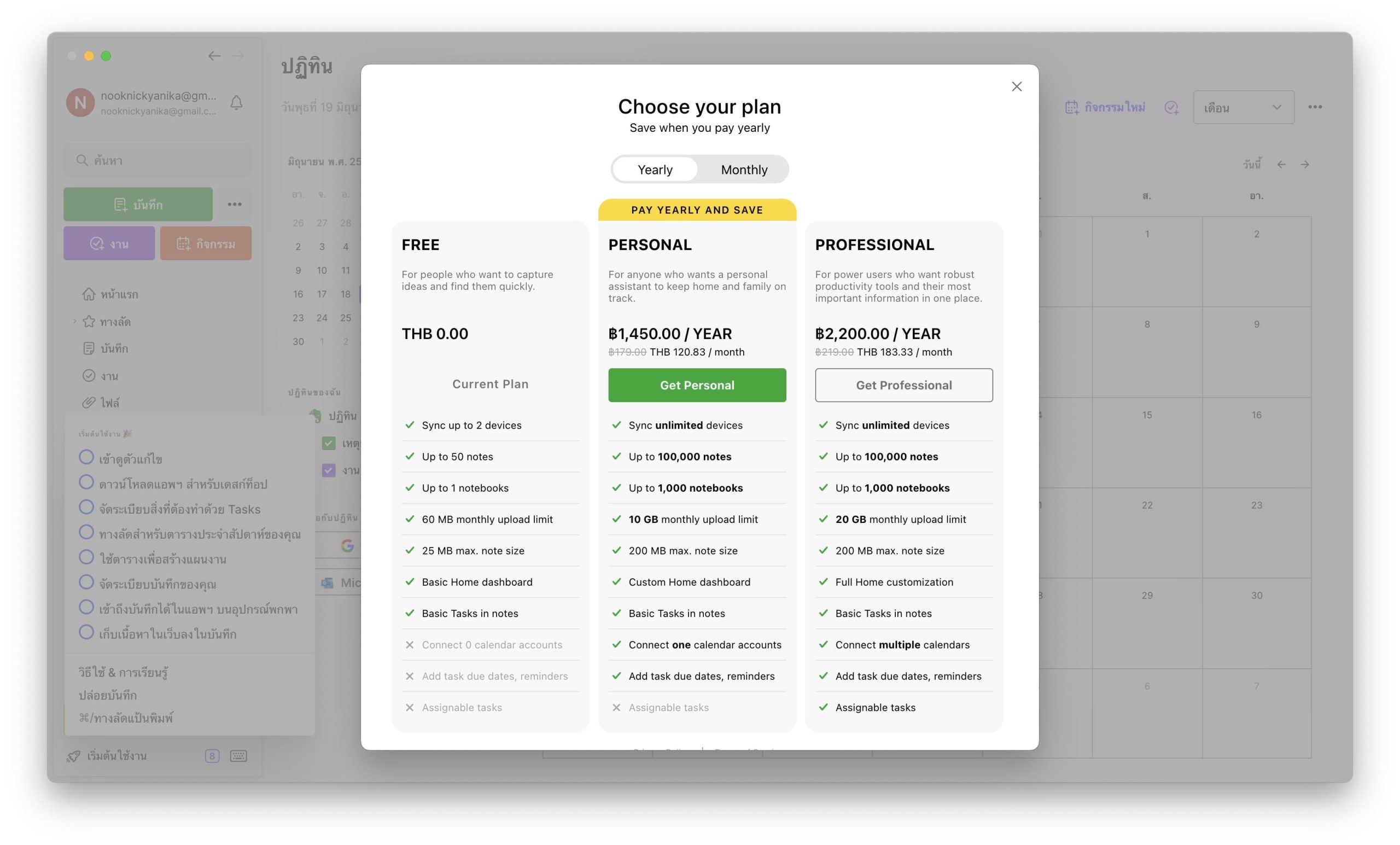 หากใช้งานแบบฟรี คุณจะสามารถสร้างการจดบันทึกได้สูงสุด 50 หน้า ซิงค์ได้สูงสุด 2 อุปกรณ์ และมีข้อจำกัดอื่น ๆ ตามข้อมูลในภาพด้านล่าง แต่หากอยากปลดล็อคคุณสมบัติอื่น ๆ แนะนำให้สมัครเป็นสมาชิก มีค่าใช้จ่ายเพียง 1,450฿/ปี เท่านั้น จ