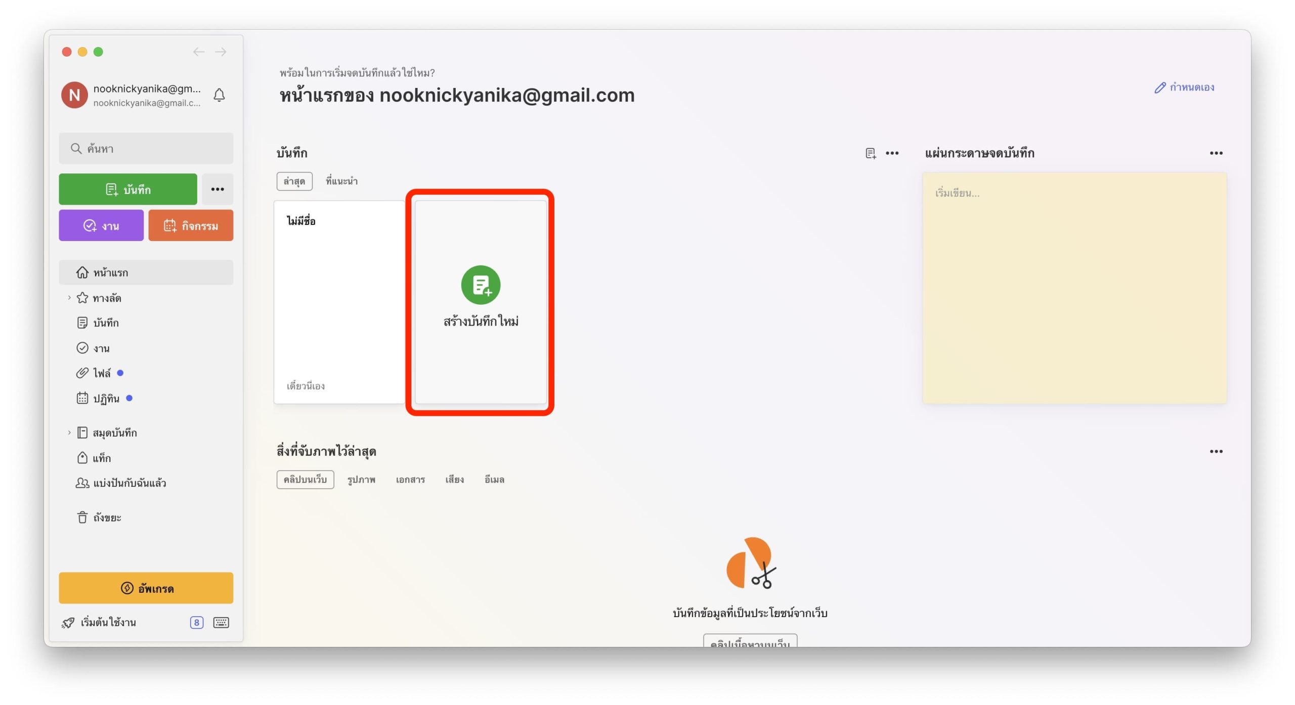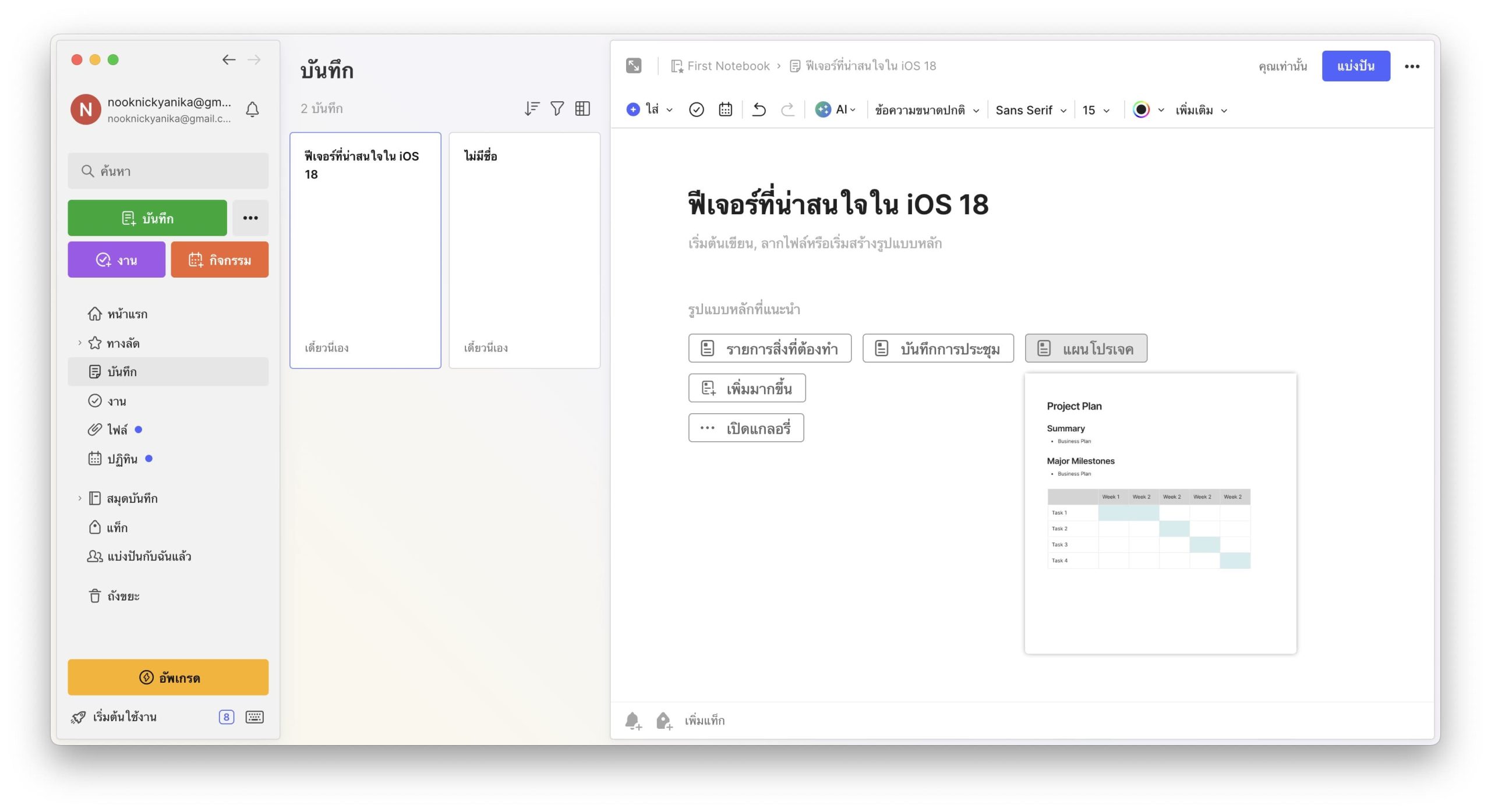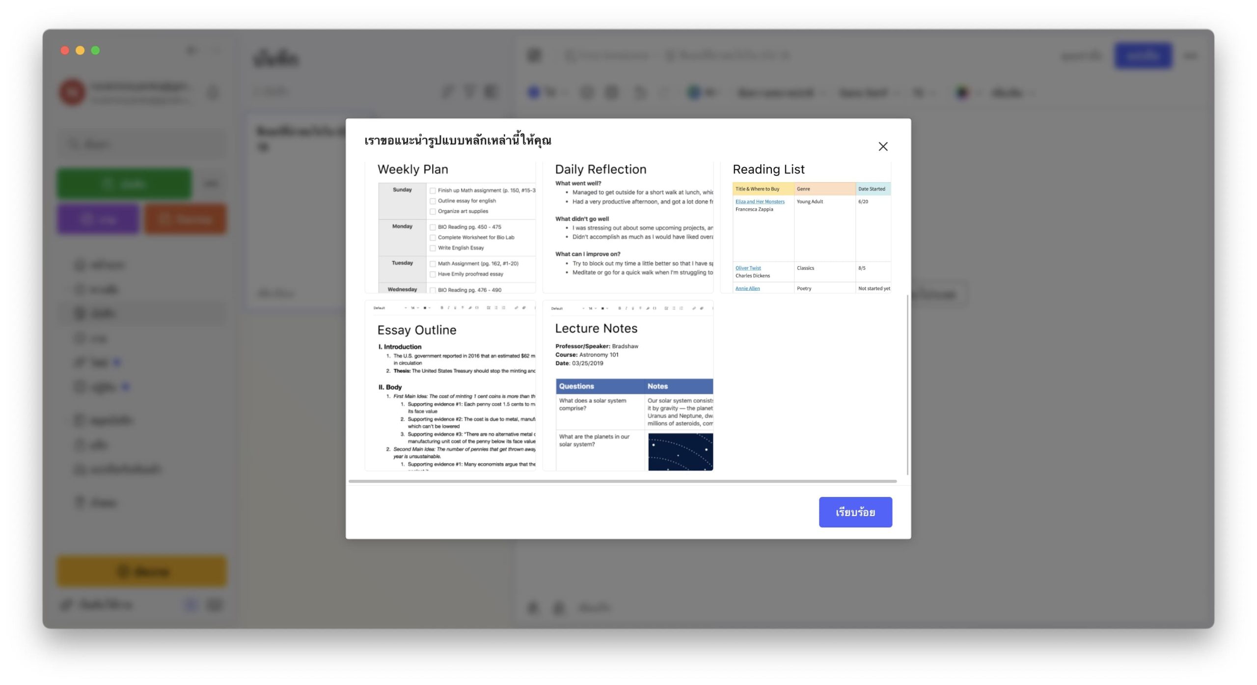 ในหน้าการจดบันทึกจะมีรูปแบบ (Template) แนะนำขึ้นมา เช่น การบันทึกการประชุม แผนโปรเจค รายการสิ่งที่ต้องทำ เมื่อกดใช้งาน เราไม่จำเป็นต้องสร้าง Template มาใช้เองให้เหนื่อย