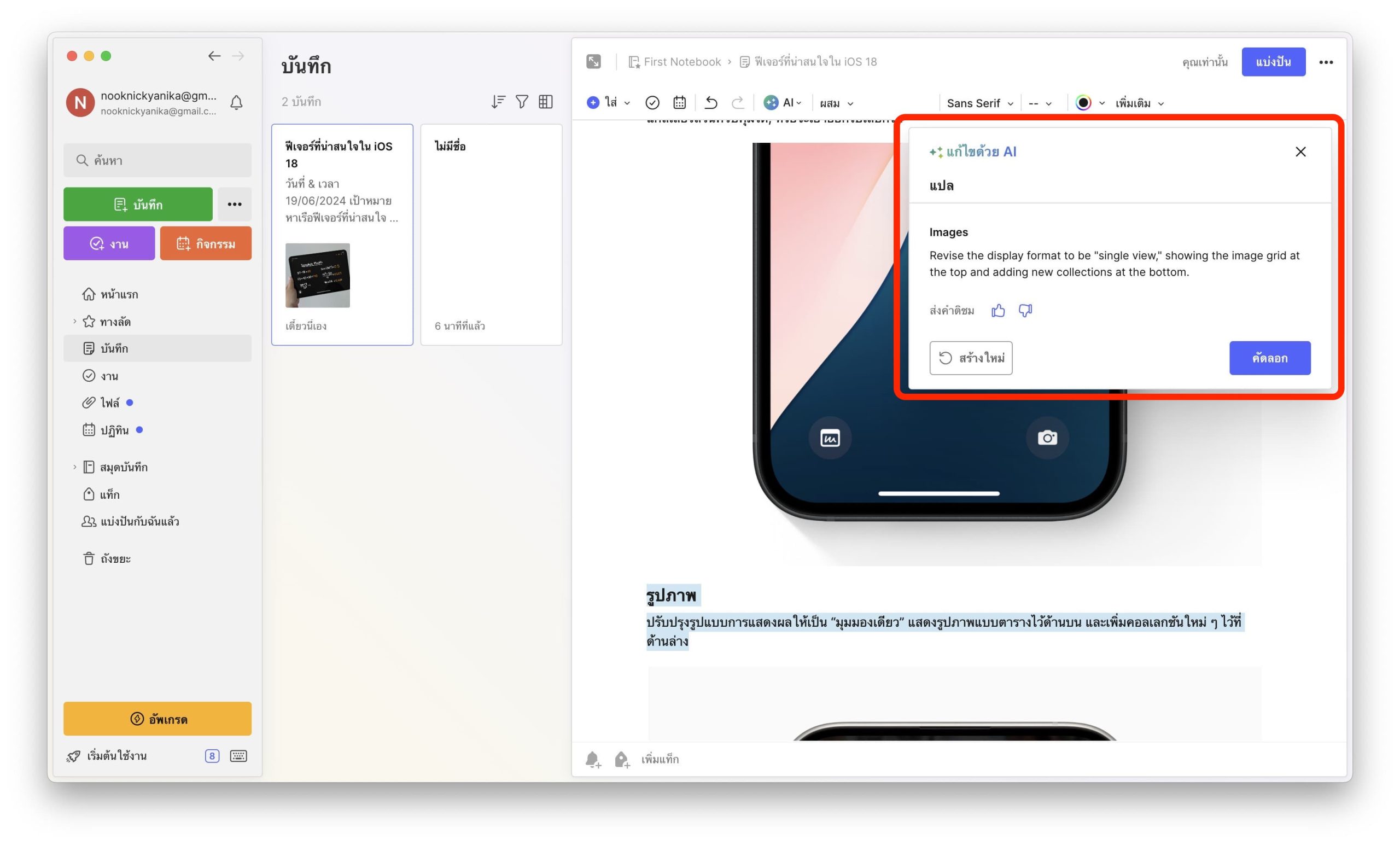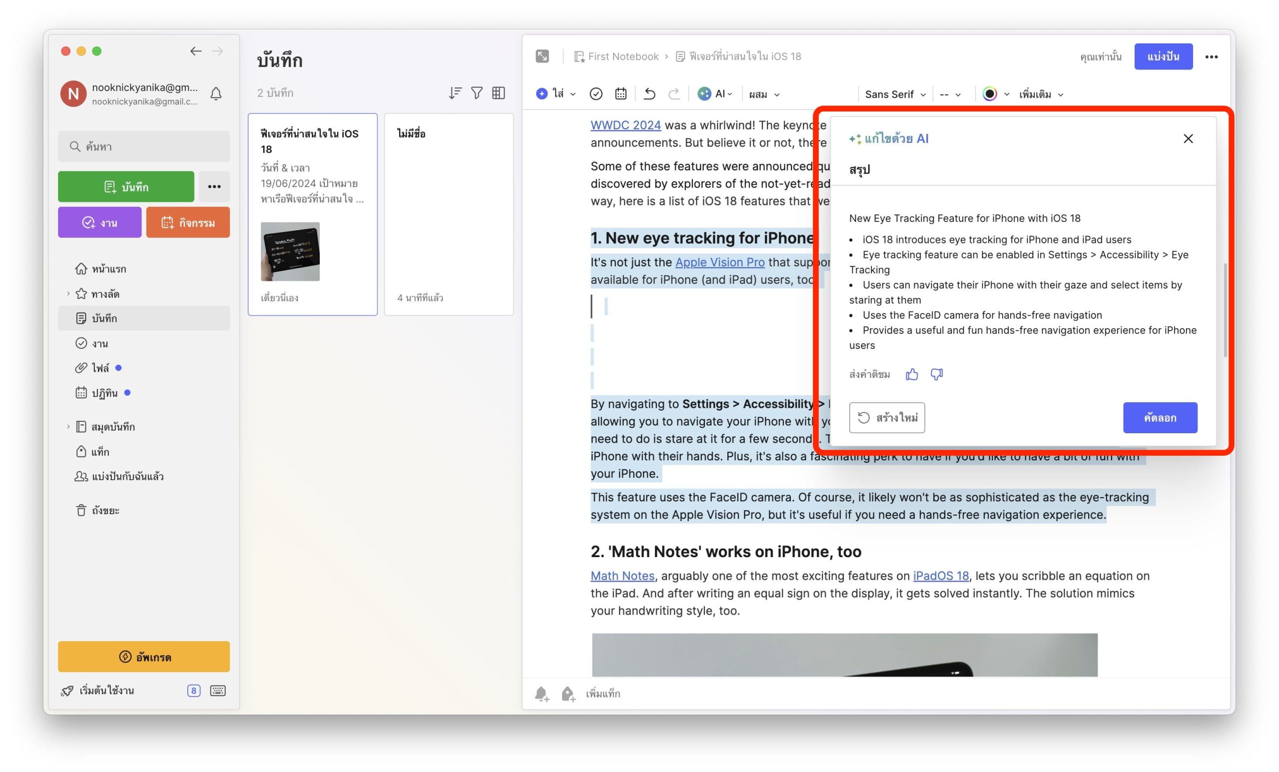 ข้อดีอีกอย่างคือมี AI ภายในแอปให้ใช้งาน เพียงกดที่เมนู AI ที่แถบเครื่องมือก็สามารถใช้งาน AI ได้เลย