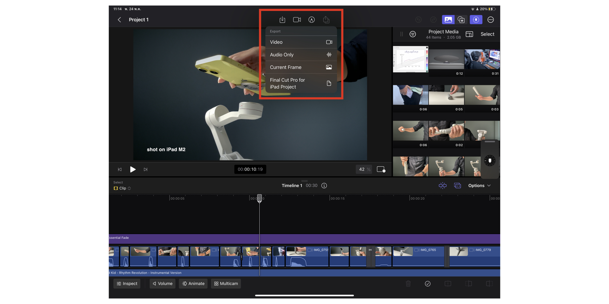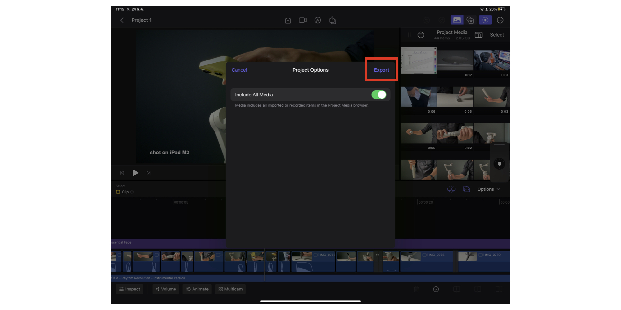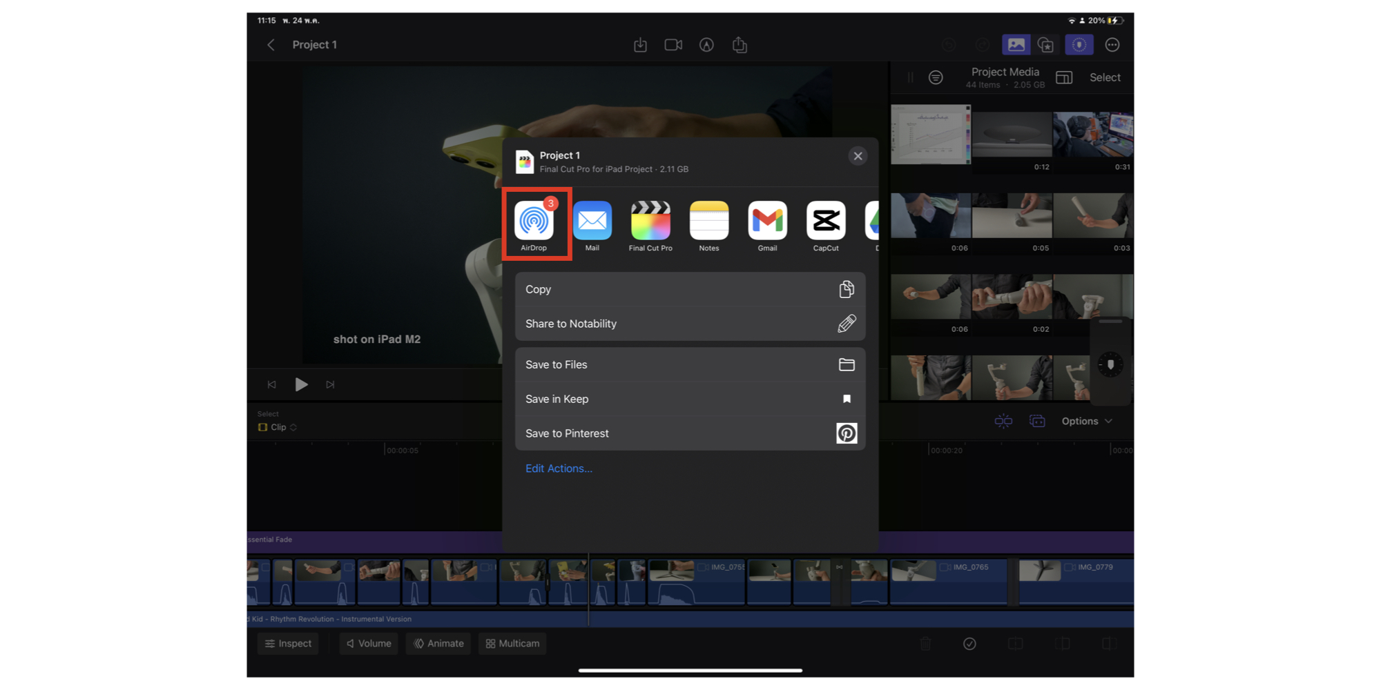 เข้าไปที่หน้าการตัดต่อ > แตะที่ไอคอนแชร์ > เลือก “Final Cut Pro for iPad Project”