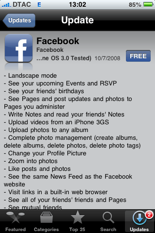 เมื่อวานทาง App Store ได้เปิดให้ผู้ใช้สามารถอัปเดต Facebook 3.0 ได้แล้วครับ โดยให้เข้าไปที่ App Store ผ่านทางไอโฟนหรือว่า iTune ก็ได้ครับ แต่ผมว่าผ่านทางไอโฟนสะดวกกว่านะ (-: จากนั้นเราก็อัปเดตได้เลยครับ ที่ตัว App Store จะมีเมนู Update ที่มุมล่างขวาให้เลือกครับ หากว่าเครื่องเราเคยติดตั้ง Facebook มาแล้ว ระบบจะให้ทำการอัปเดต หรือหากว่ายังไม่ได้ติดตั้งก็สามารถค้นหาด้วยคำว่า Facebook แล้วทำการติดตั้งได้ทันทีนะครับ