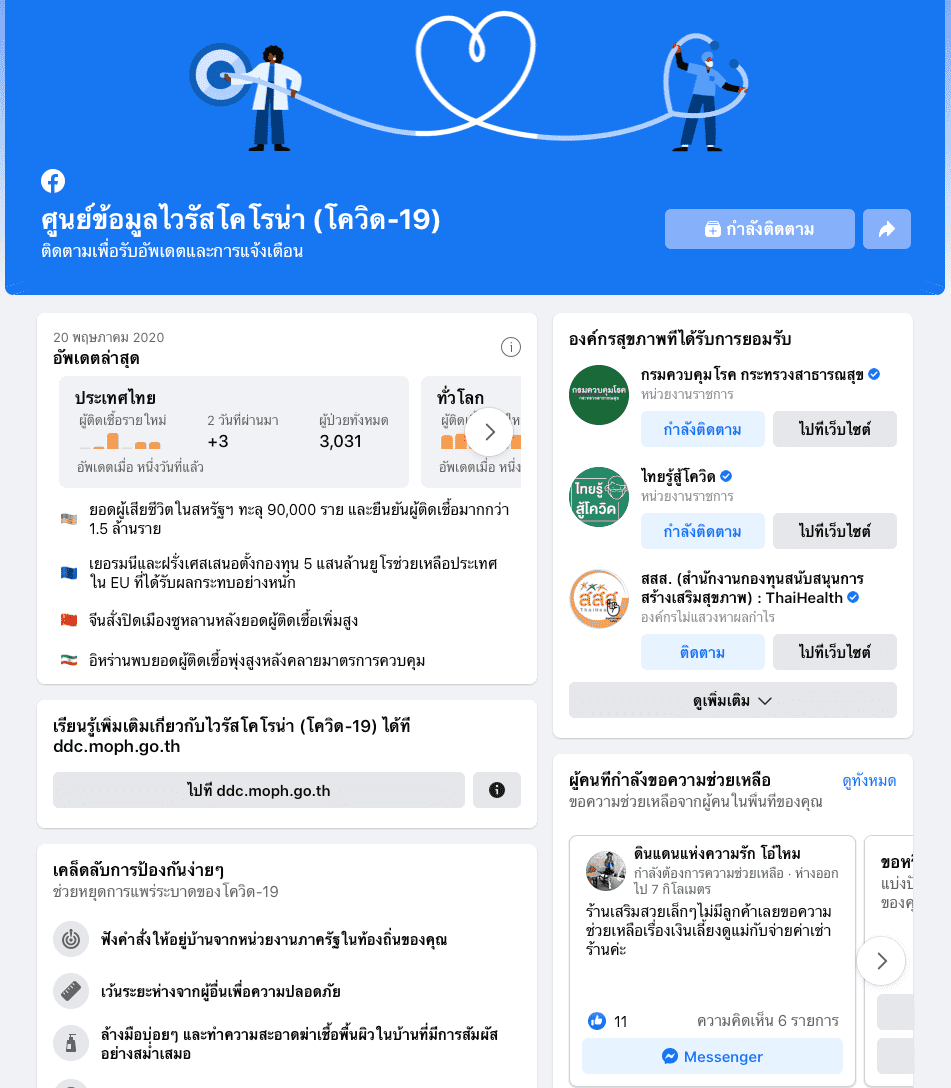 Facebook ได้เพิ่มเมนูศูนย์ข้อมูลโควิด-19 เพื่อให้ผู้ใช้สามารถติดตามข้อมูล ข่าวสาร และอัปเดตสถานการณ์โควิด-19 ได้จากแหล่งข้อมูลที่น่าเชื่อถือ