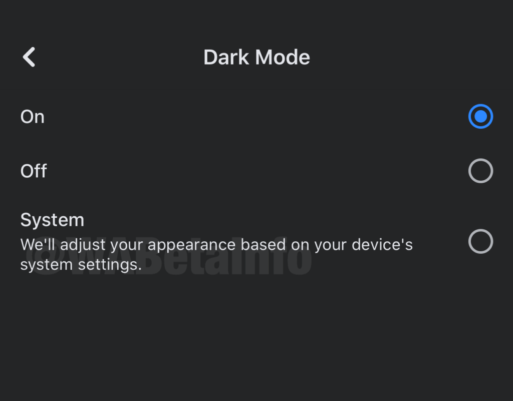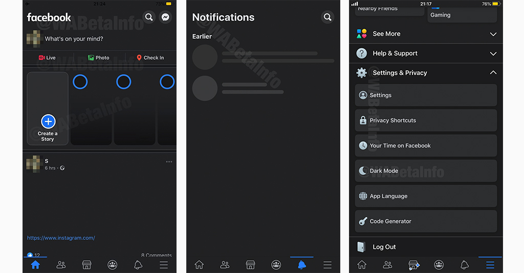 แหล่งข่าว WABetaInfo ได้เผยภาพหน้าจอของ Facebook บน iOS ที่มาพร้อมกับฟีเจอร์ Dark Mode เห็นได้ว่าโทนสีของ Facebook นั้จะไม่ได้เป็นสีดำสนิทเหมือนกับ Instagram และ Messenger แต่เป็นการใช้สีเทาเข้มแทน ส่วนตัวอักษรและโลโก้ก็เน้นเป็นสีขาว