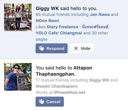 เมื่อกดปุ่ม “Hello” (สวัสดี) แล้วระบบก็จะแจ้งเตือนว่ามีเพื่อนมาทักทายเรา และเราสามารถดูรายละเอียดและทักทายเพื่อนกลับได้