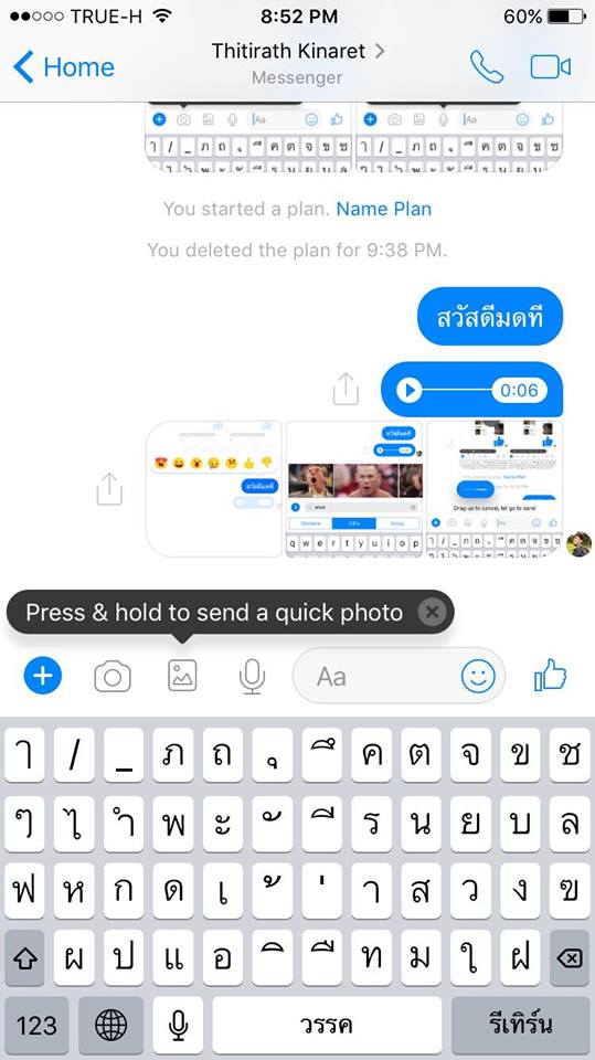 Photo สำหรับส่งไฟล์รูปภาพหรือวิดีโอโดยเลือกจากในคลัง และถ้าหากกดไอคอนค้างไว้ก็จะเปิดโหมด Quick Photo เพื่อถ่ายรูปหรืออัดวิดีโอแบบด่วนแล้วส่งผ่านห้องสนทนาทันที