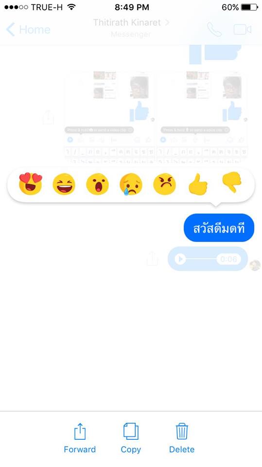แตะที่ข้อความค้างไว้จะมีไอคอน emoji ออกมาให้เลือก เช่น Dislike และสามารถแตะที่ข้อความของเราที่สนทนากับคนอื่นค้างไว้จะเลือก ลบ (Delete), ส่งต่อ (Forward) หรือ คัดลอก (Copy) ข้อความได้