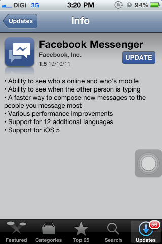 การเปลี่ยนแปลงหลักๆสำหรับ Facebook Messenger 1.5 คือ การรองรับ iOS 5 และเราสามารถเห็นสถานะของคู่สนทนาที่กำลังพิมพ์ข้อความนั้นๆอยู่ (ลักษณะเหมือน Whatsapp ที่คุ้นเคยกัน) นอกจากนี้ยังรองรับภาษาต่างๆเพิ่มขึ้นอีกถึง 12 ภาษาอีกด้วย