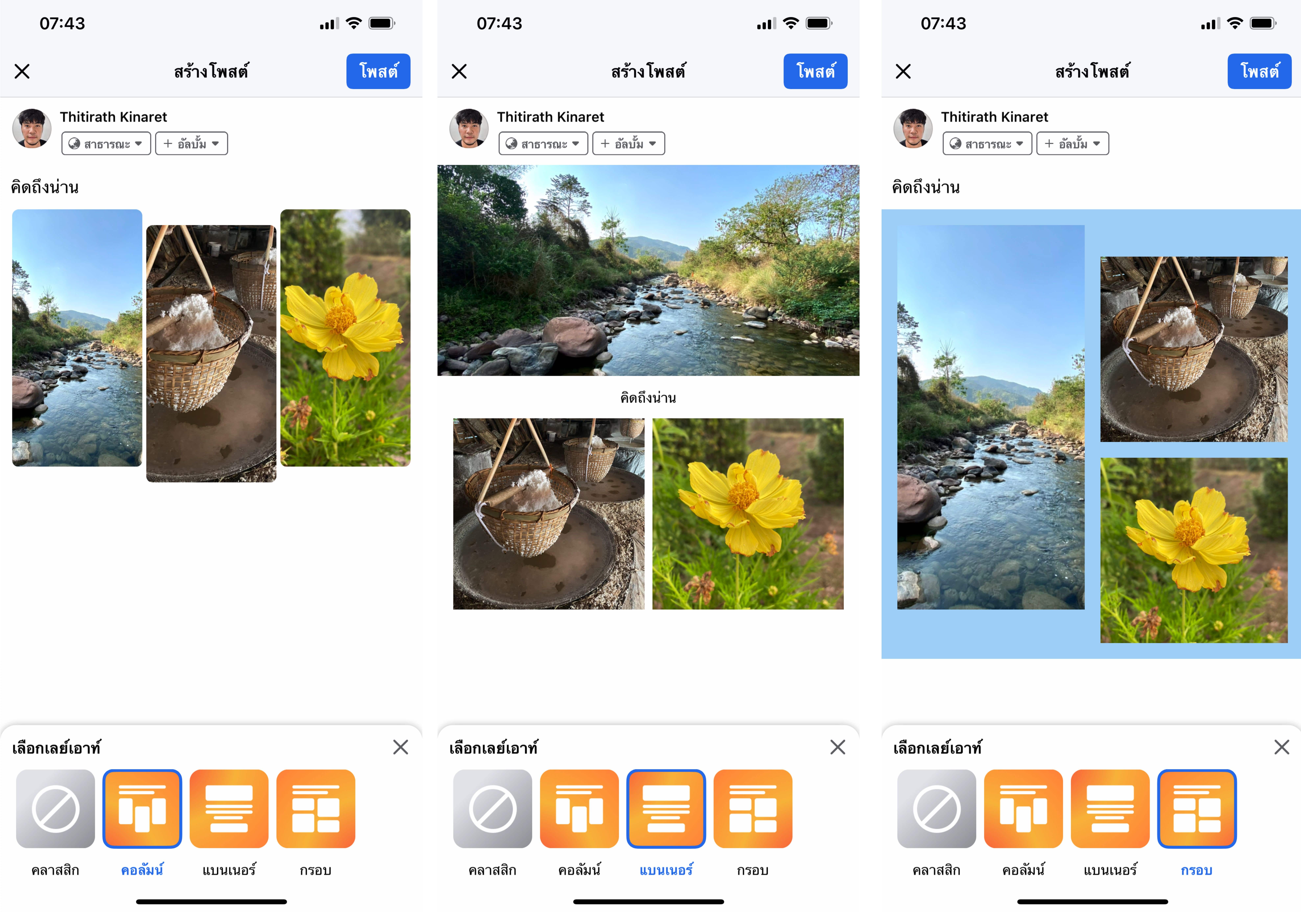 สำหรับการใช้เลย์เอาท์นั้น ให้ผู้ใช้แตะ “รูปภาพ” > เลือกรูปภาพหลาย ๆ ภาพ > จากนั้นระบบจะให้เลือกเลย์เอาท์ที่ต้องการ