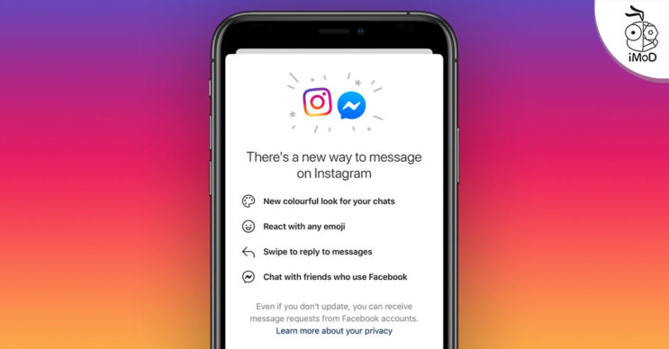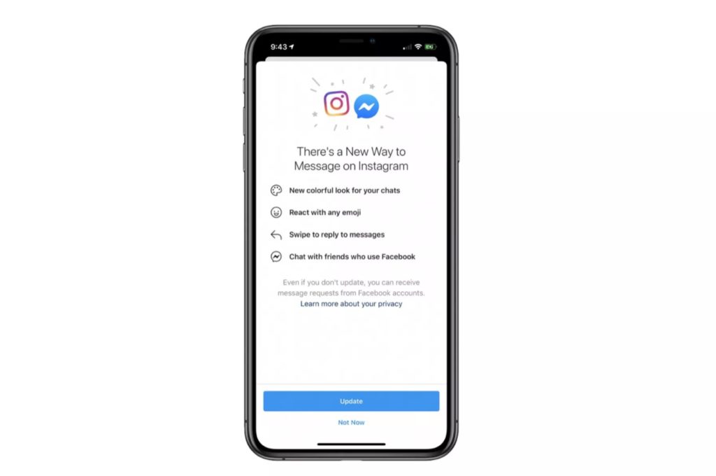 ผู้ใช้ Instagram บางคนได้รับการแจ้งเตือนให้เข้าร่วมบัญชีกับ Messenger ซึ่งจะยกฟีเจอร์ต่าง ๆ ของการแชทในแอป Messenger ไปยัง Instagram ทั้งหมด ไม่ว่าจะเป็นการเปลี่ยนสีห้องแชท การตอบกลับด้วยอิโมจิ และการตอบกลับแต่ละข้อความ