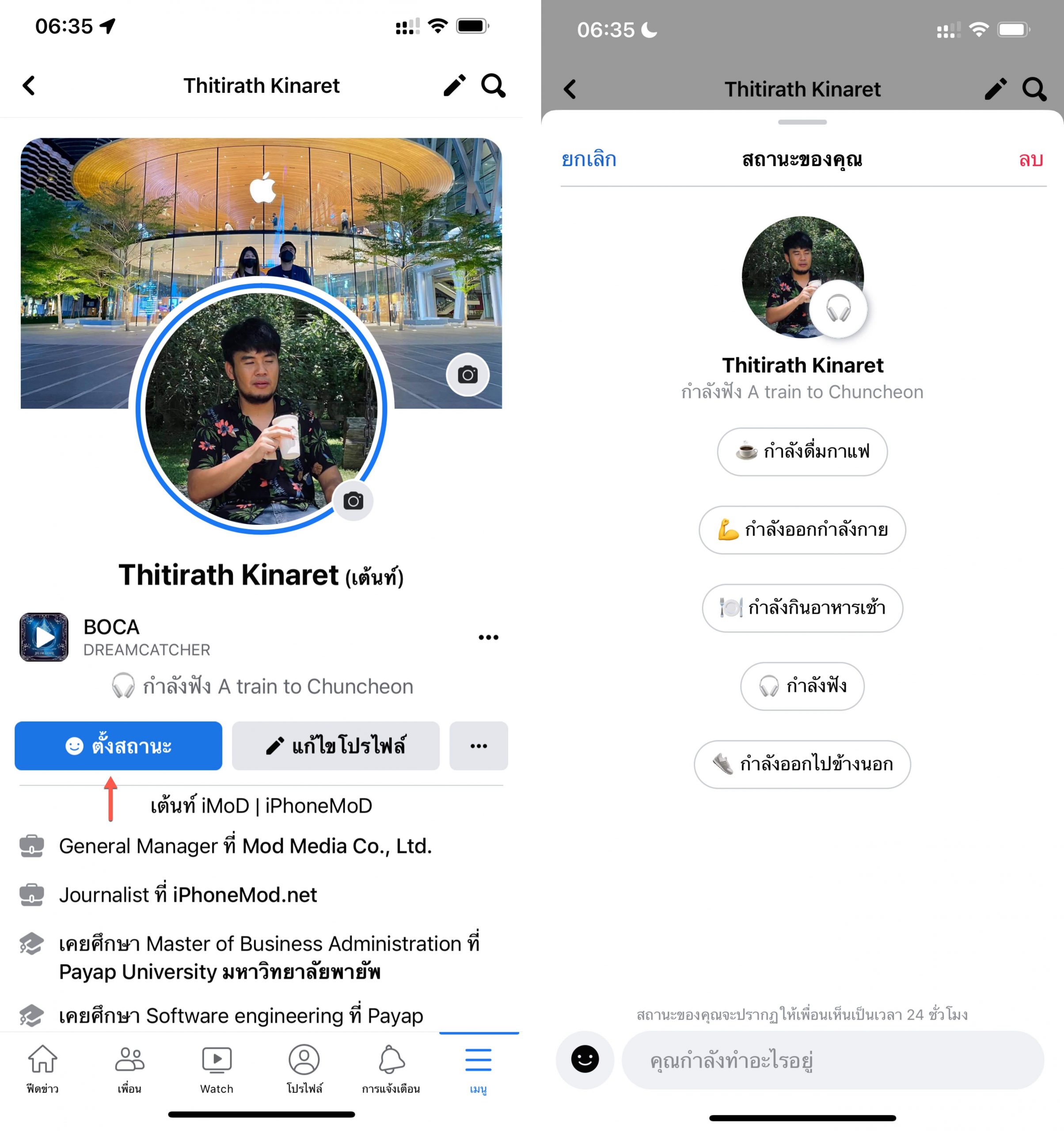 สำหรับการตั้งค่าสถานะทำได้โดย ไปหน้าโปรไฟล์ของเรา > แตะ ตั้งสถานะ