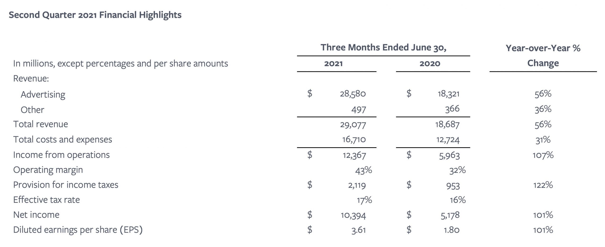 Facebook ประกาศผลประกอบการไตรมาส 2 ปี 2021, มีรายได้เพิ่ม 56% เติบโตมากกว่า Apple, Microsoft ถึงแม้จะได้รับผลกระทบจากนโยบายความเป็นส่วนตัวของ iOS ก็ตาม