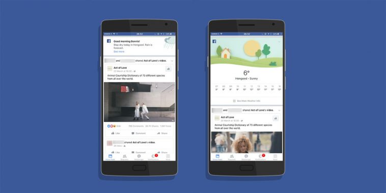 ผู้ใช้งาน Facebook บางรายในอังกฤษตรวจพบการปรับปรุงสภาพอากาศในหน้า Feed ทั้งบนระบบปฏิบัติการ Android และ iOS พวกเขามองเห็นเป็นลักษณะการ์ดแนะนำในแต่ละวัน พร้อมกับคำอธิบายสั้น ๆ เกี่ยวกับสภาพอากาศนอกจากนี้ยังสามารถคลิกไปที่ลิงค์เพื่อดูเพิ่มเติม โดยจะสามารถดูอุณหภูมิสูงสุดและต่ำสุดในแต่ละวัน