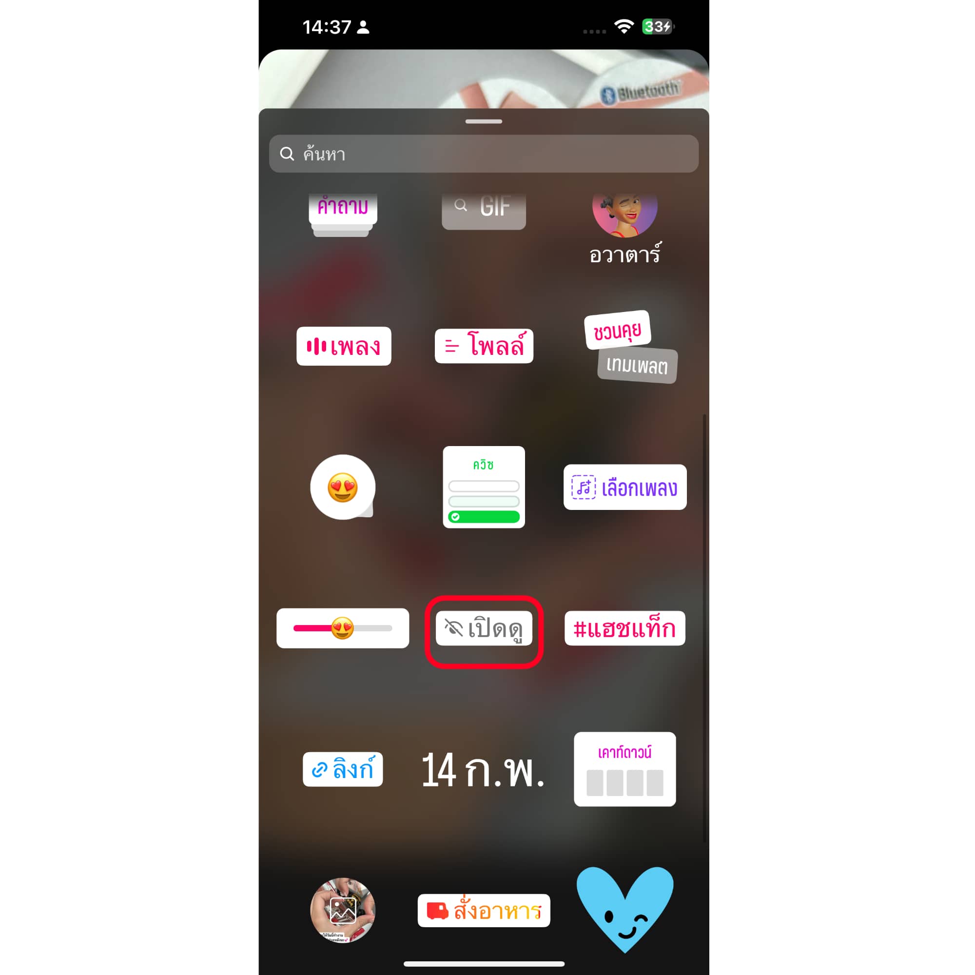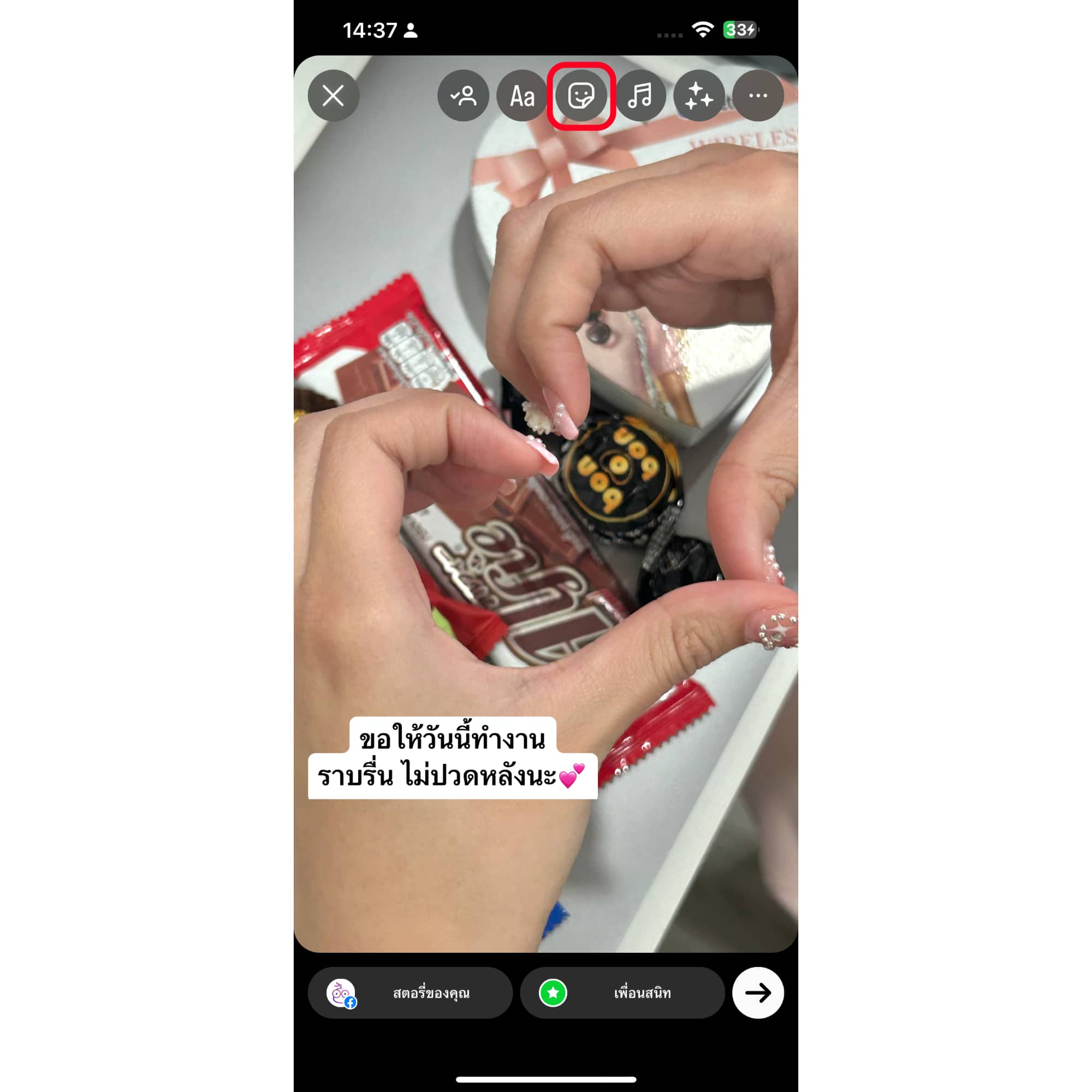 ให้เราเลือกรูปที่ต้องการ แล้วตกแต่งสตอรี่ตามชอบ แล้วกดเลือก “สติ้กเกอร์”