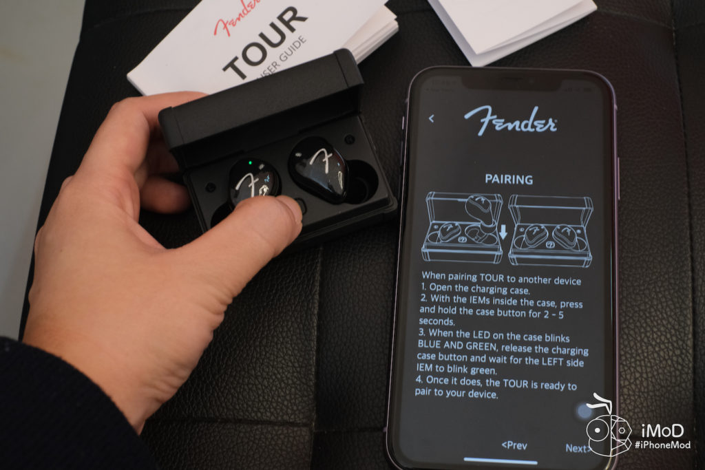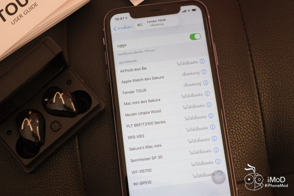 หูฟังด้านซ้ายจะแสดงไฟสีเขียวกระพริบ ให้เราเข้าไปยังการตั้งค่าของโทรศัพท์แล้วแตะเลือกชื่ออุปกรณ์ Fender TOUR เพื่อเชื่อมต่อ จากนั้นก็เปิดเพลงฟังและใช้งานได้ทันที