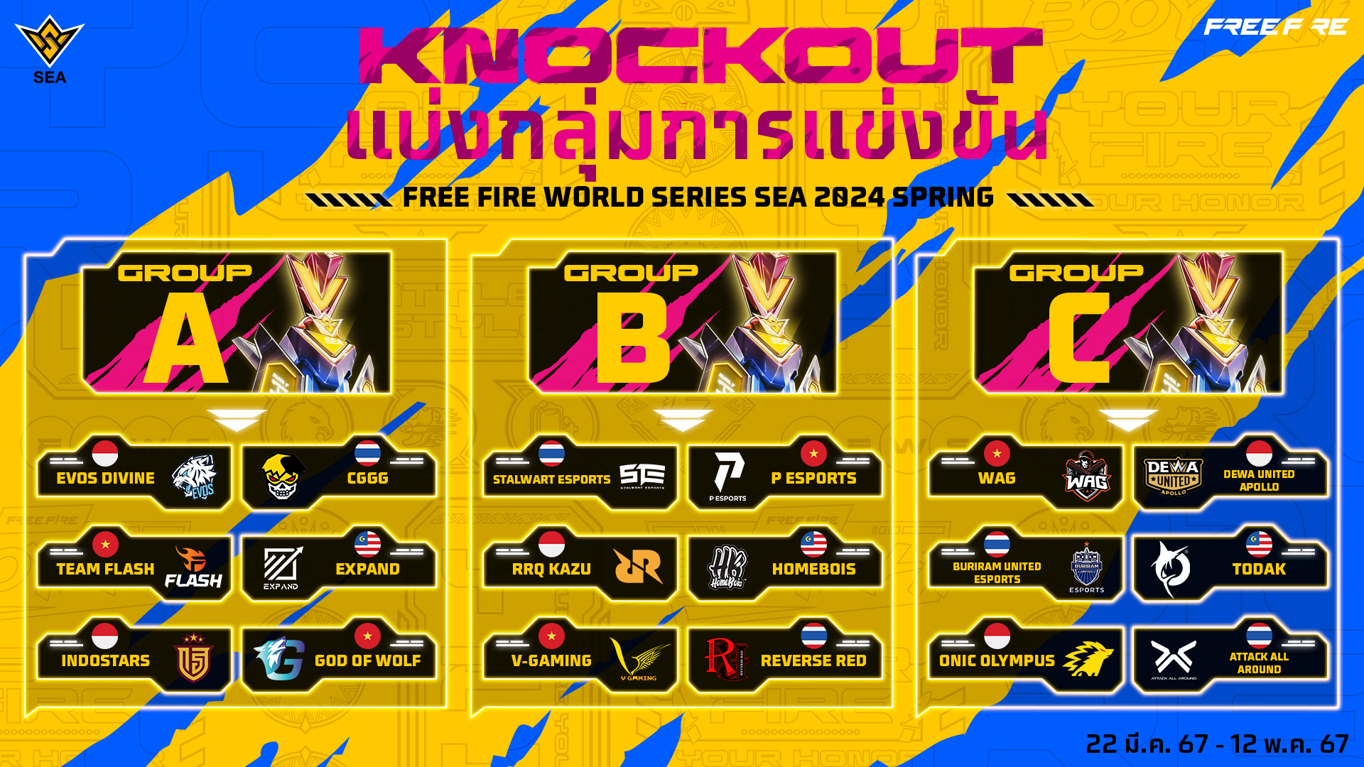 การีนา ประกาศผลการจับสายรอบน็อคเอ้าท์สำหรับการแข่งขันรายการ Free Fire World Series Southeast Asia (FFWS SEA) 2024 Spring เผยรายละเอียดการจัดกลุ่มการแข่งขันของทีมชั้นนำทั้ง 18 ทีม จากประเทศไทย อินโดนีเซีย เวียดนาม และมาเลเซีย ตั้งแต่วันที่ 22 มีนาคม – วันที่ 12 พฤษภาคม 67 โดยทีมเหล่านี้จะแข่งขันกันในรอบน็อคเอ้าท์ เพื่อคัดเลือก 12 อันดับแรกเพื่อเข้าสู่รอบเก็บคะแนน Point Rush และรอบชิงชนะเลิศที่จะจัดขึ้นที่ฟู้เถาะ สเตเดียม นครโฮจิมินห์ ประเทศเวียดนาม ในวันที่ 24 – 26 พฤษภาคม 67 ที่จะถึงนี้