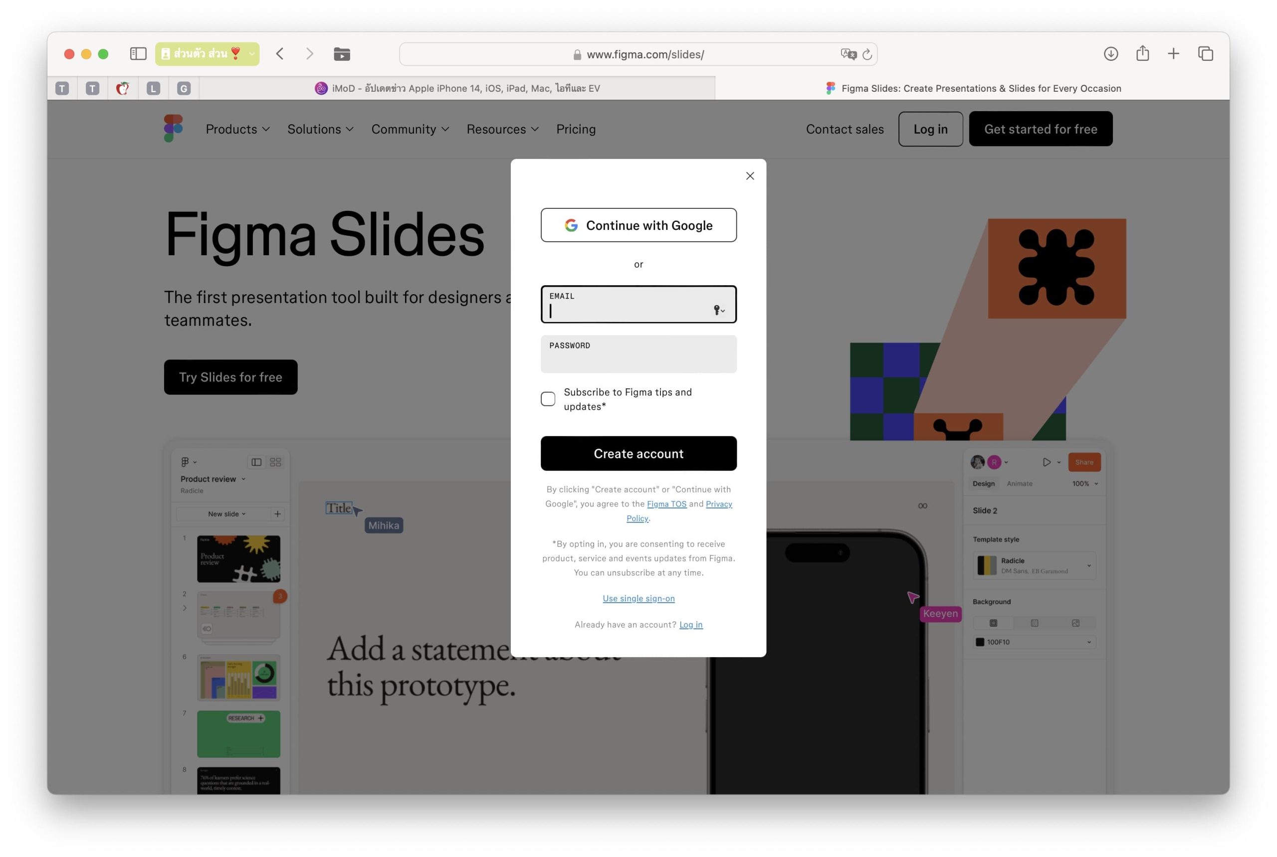 เมื่อเข้าไปที่เว็บไซต์ https://www.figma.com/slides/ คุณจะต้องสร้างบัญชีใหม่ หรือใช้บัญชี Google ในการล็อกอินก็ได้
