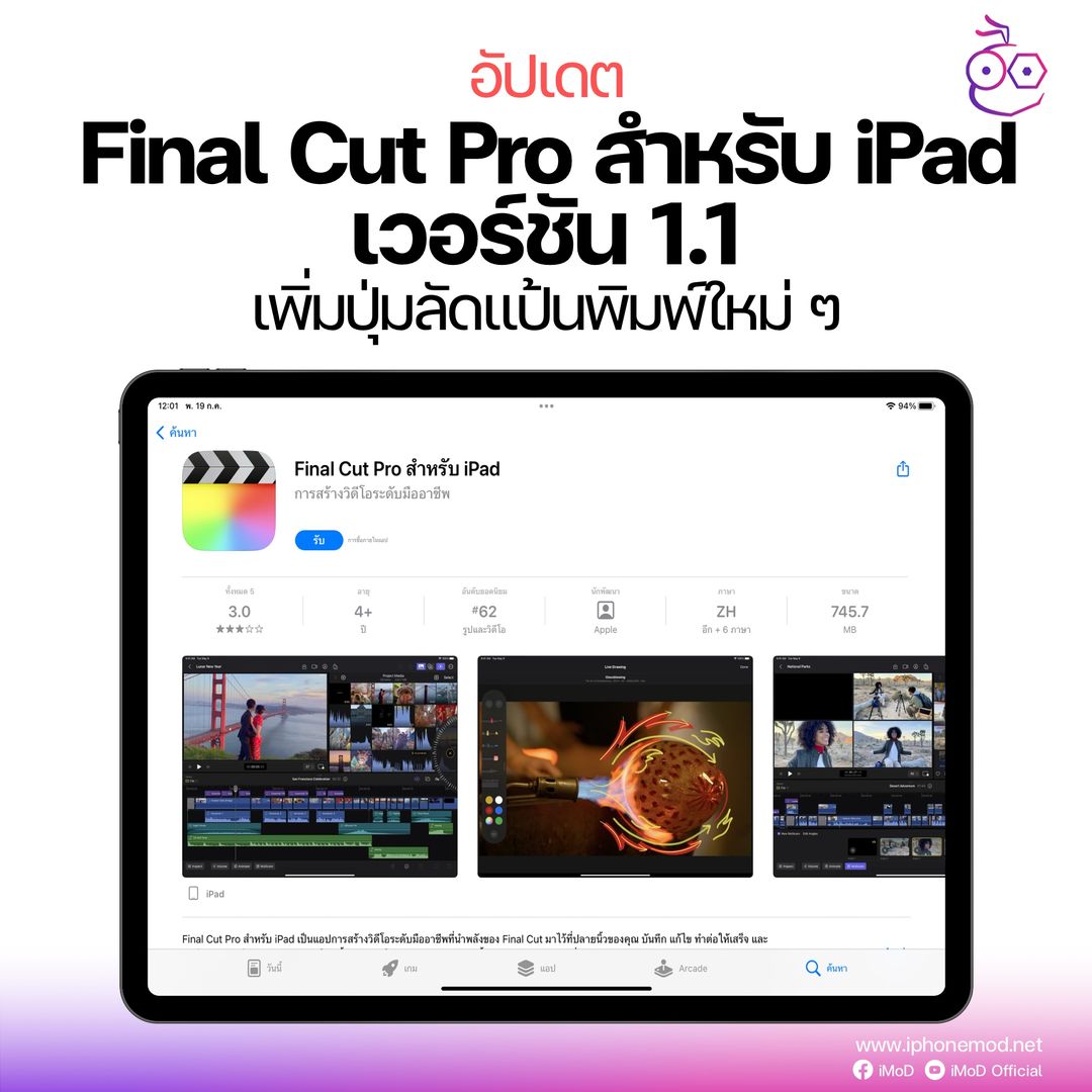 ล่าสุดวันที่ 18 ก.ค. Apple ได้อัปเดตซอฟต์แวร์ Final Cut Pro สำหรับ iPad เวอร์ชัน 1.1 ออกมาให้สามารถใช้งานปุ่มลัดบนแป้นพิมพ์ที่เป็นอุปกรณ์เสริมได้ เพื่อให้ผู้ใช้สามารถทำงานได้เป็นมืออาชีพและสะดวกมากขึ้น