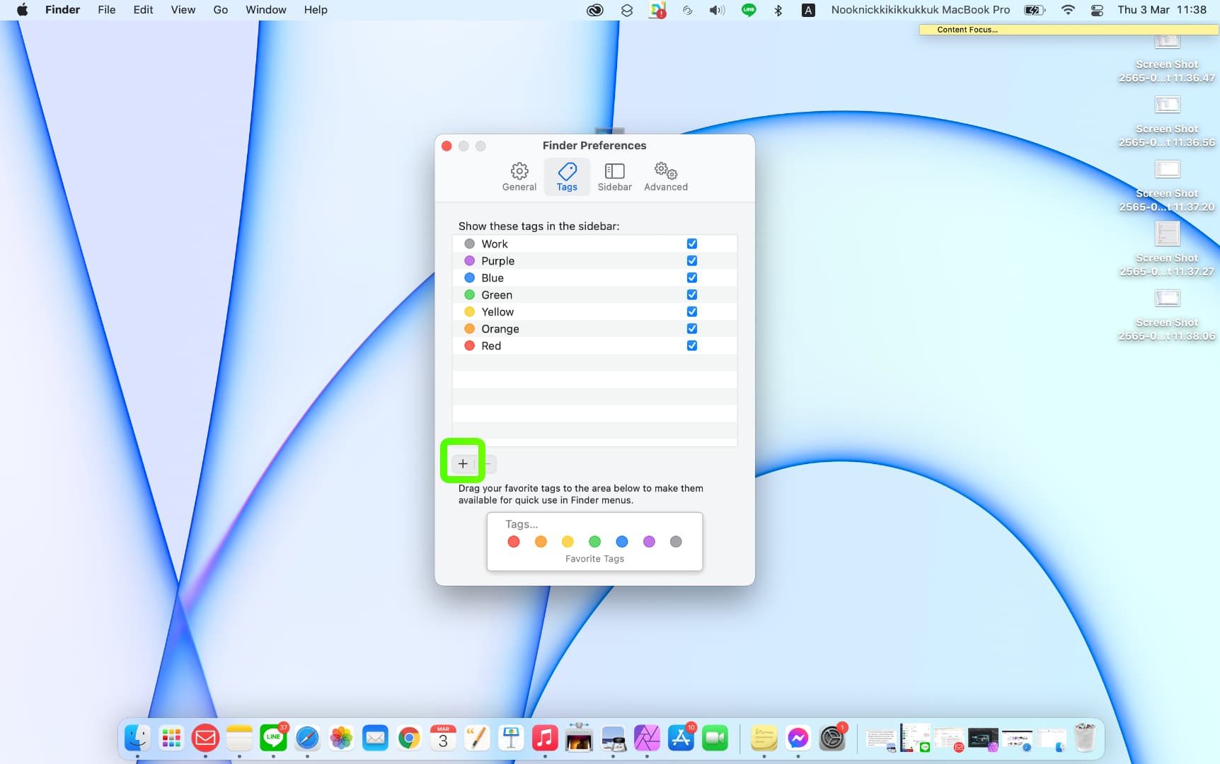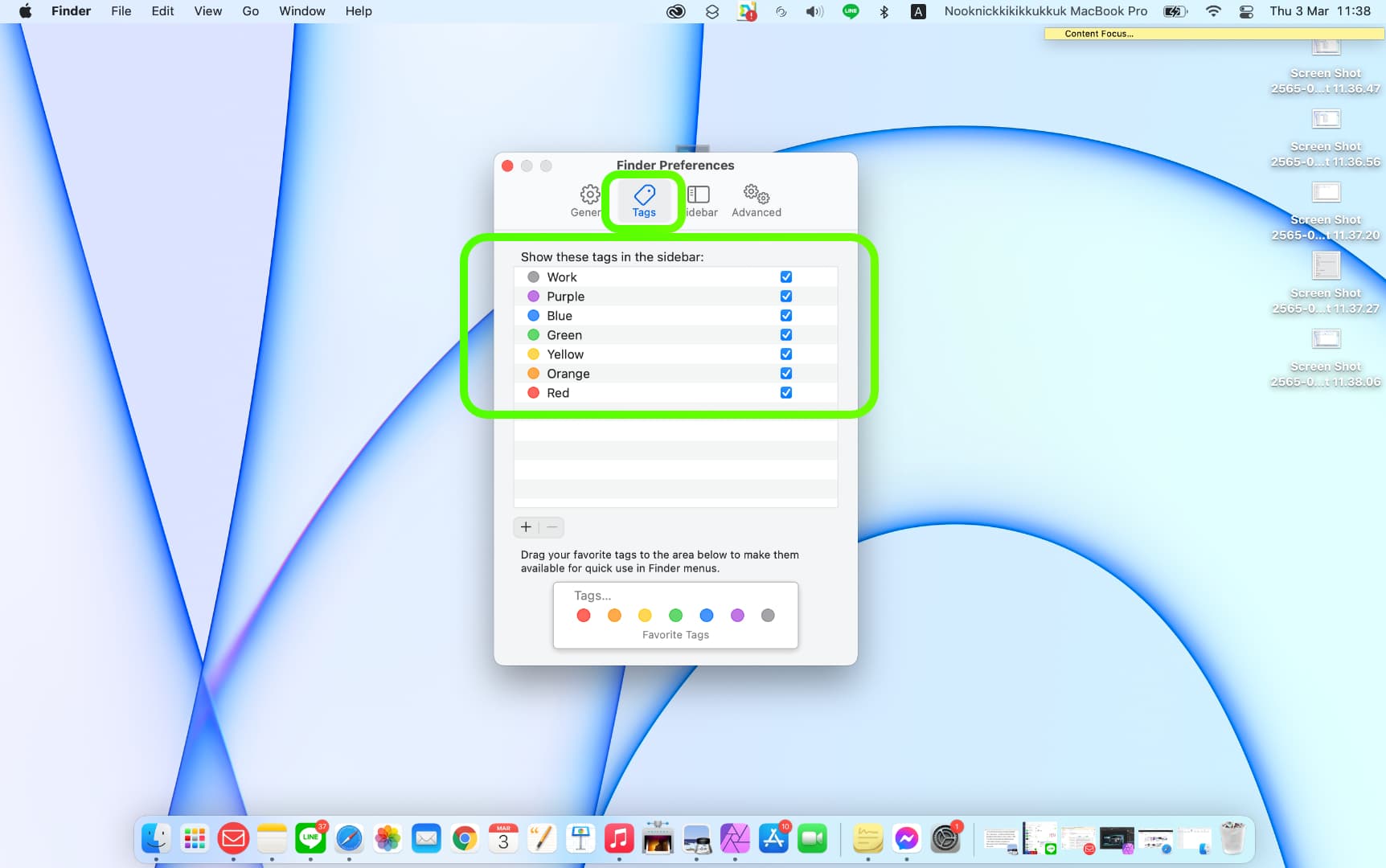ถัดมาด้านล่างจะเป็นส่วนของการนำแท็กที่เราใช้บ่อย ๆ มาไว้บนเมนู Finder ในตอนที่เราคลิกขวาที่ไฟล์ก็จะสามารถเลือกใช้แท็กที่ตั้งค่าไว้ได้จากตรงนี้ วิธีการก็คือ ให้ลากแท็กที่ต้องการจะใช้ไปไว้ในกรอบด้านล่าง โดยจะได้ได้มากที่สุด 7 แท็กด้วยกัน