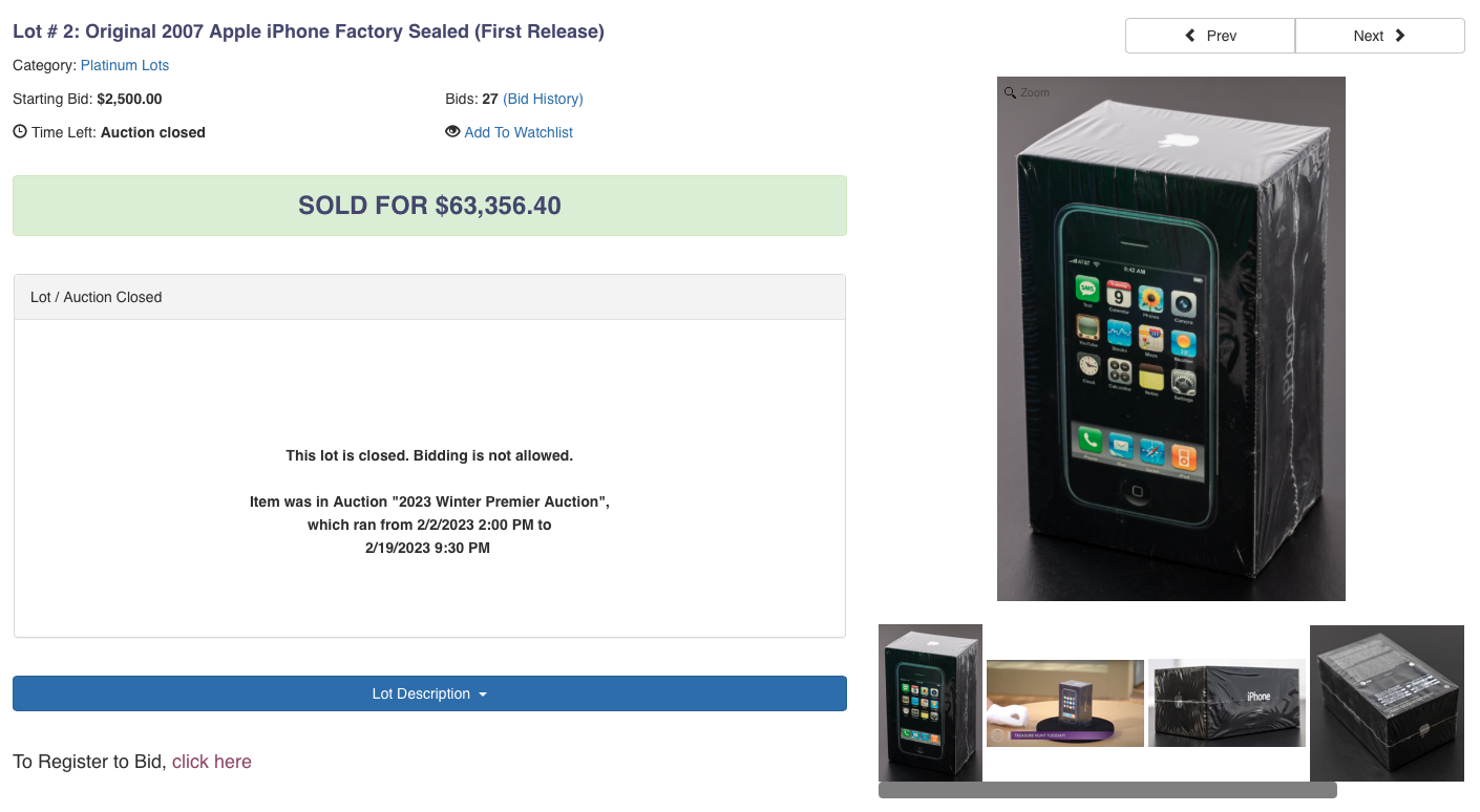 LCG Auctions ได้เปิดประมูล iPhone รุ่นแรกไม่แกะซีลเมื่อวันที่ 2 ก.พ. 2023 ที่ผ่านมา และเคาะราคาสิ้นสุดวันที่ 19 ก.พ. 2023 โดยมีการยื่นประมูลมากถึง 27 ครั้ง เคาะราคาประมูลสุดท้ายอยู่ที่ 63,356.40 ดอลลาร์ หรือมากกว่าราคาเปิดขายที่หน้าร้านครั้งแรก 105 เท่า (599 ดอลลาร์)