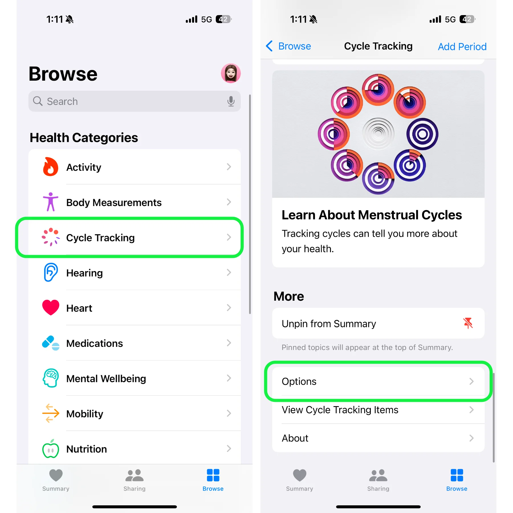 • ที่เมนู Browse ให้เลือกเมนู Cycle Tracking (การติดตามรอบเดือน)