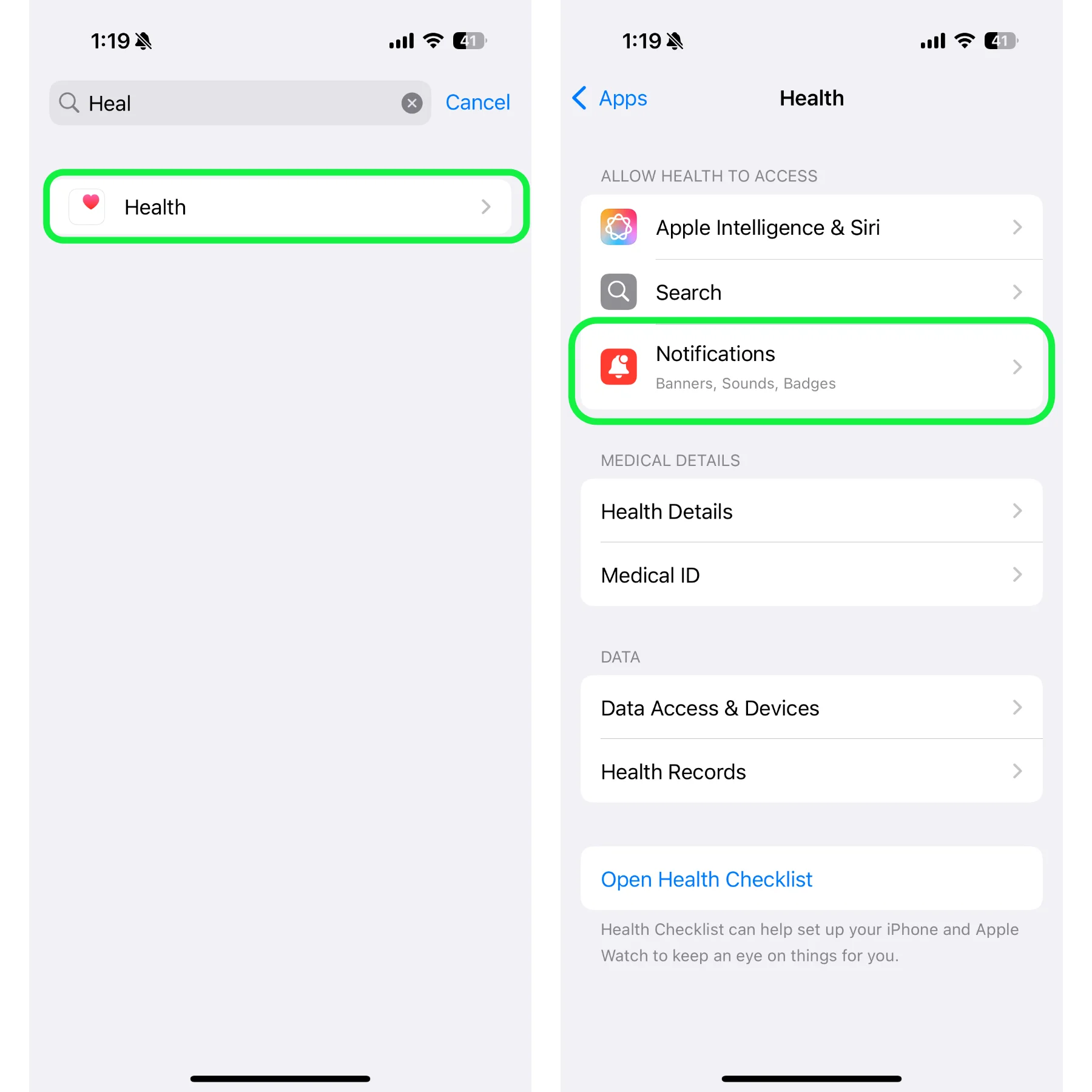 • เลือกแอป สุขภาพ (Health) > การแจ้งเตือน (Notifications)