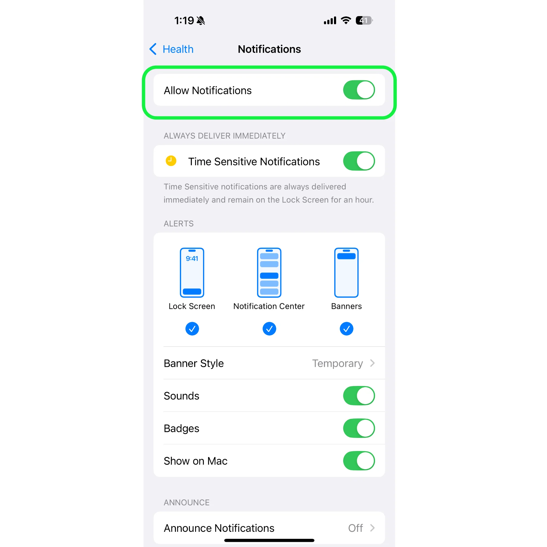 - เลือกแอป สุขภาพ (Health) > การแจ้งเตือน (Notifications)
