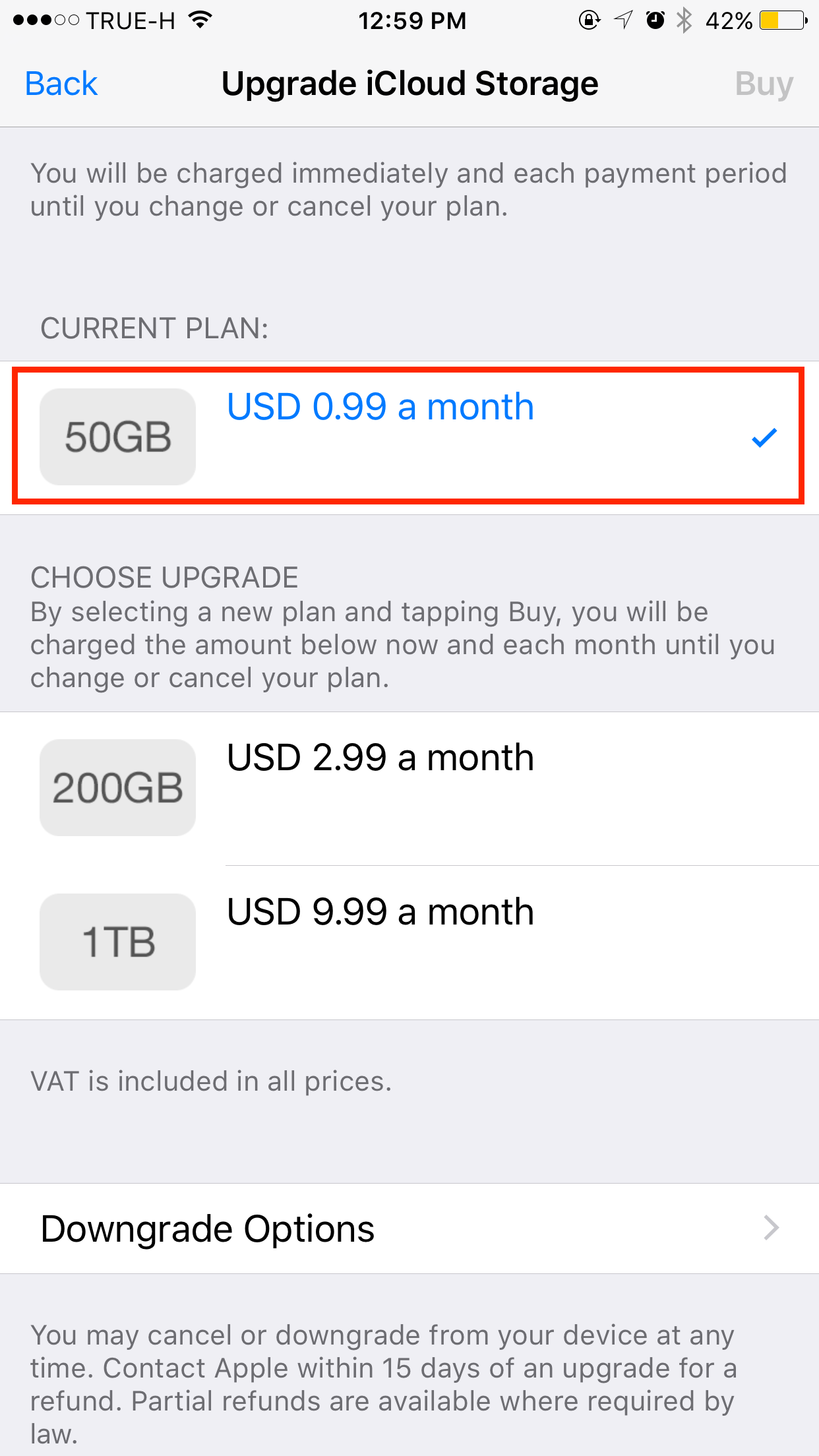 ทั้งนี้สามารถเลือกได้ว่าจะซื้อพื้นที่เยอะหรือน้อยตามที่ต้องการ ผมใช้งานอยู่แบบ 50GB จ่ายเดือนละ $0.99 หรือประมาณ 37 บาท ถือว่าไม่แพงเลย