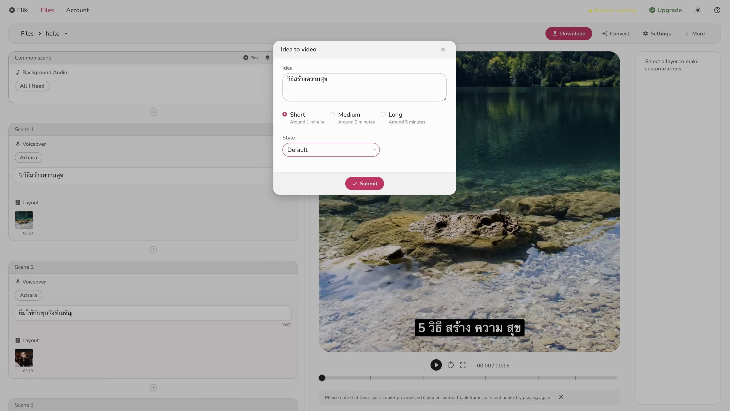 จากนั้นให้พิมพ์เรื่องที่เราต้องการทำคลิปได้เลย โดยมีเวลาและสไตล์คลิปให้เลือกอีกด้วย พอกดเสร็จแล้วให้กด “Submit”