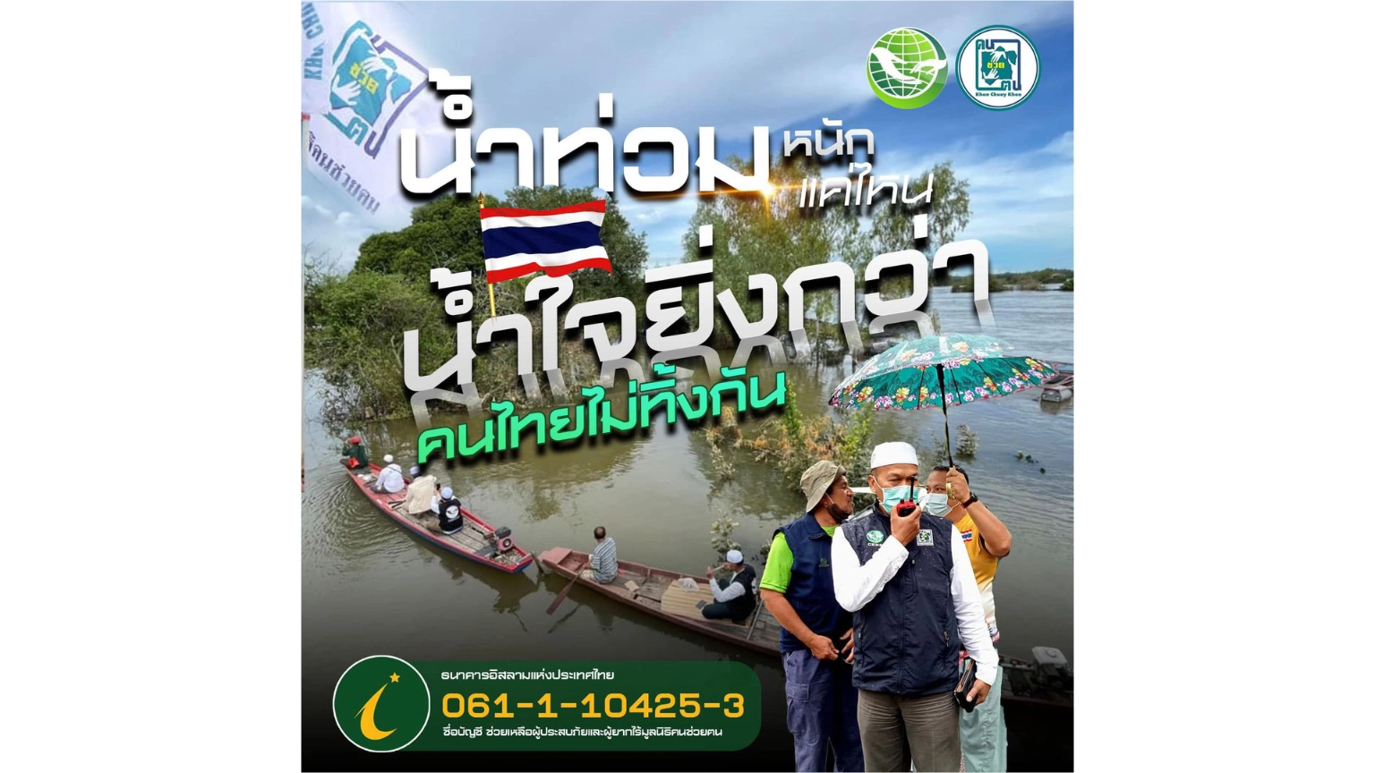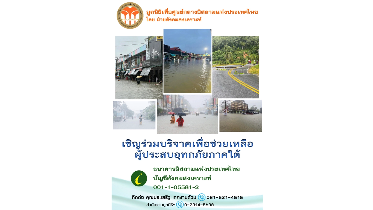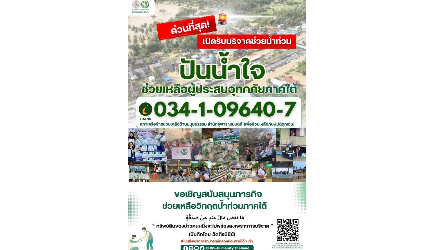 เชิญชวนพี่น้องทุกท่านร่วมส่งกำลังใจ และช่วยเหลือพี่น้องภาคใต้ที่กำลังได้รับความเดือดร้อนจากเหตุอุทกภัยน้ำท่วมในขณะนี้เพื่อส่งมอบความช่วยเหลือหลายด้านช่วยเหลือวิกฤติด้านอาหาร น้ำดื่มสะอาด ยารักษาโรค ของใช้ที่มีความจำเป็น แก่ผู้ประสบอุทกภัย ร่วมบริจาคได้ที่