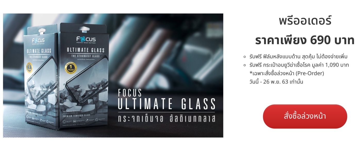 5. “โฟกัส อัลติเมท กลาส” รับประกันการใช้งานกระจกกันรอยนาน 1 ปีเต็ม หากกระจกกันรอยแตกชำรุดเสียหายสามารถเคลมเปลี่ยนได้ทันที จำหน่ายในราคาจับต้องได้เพียง 690 บาท