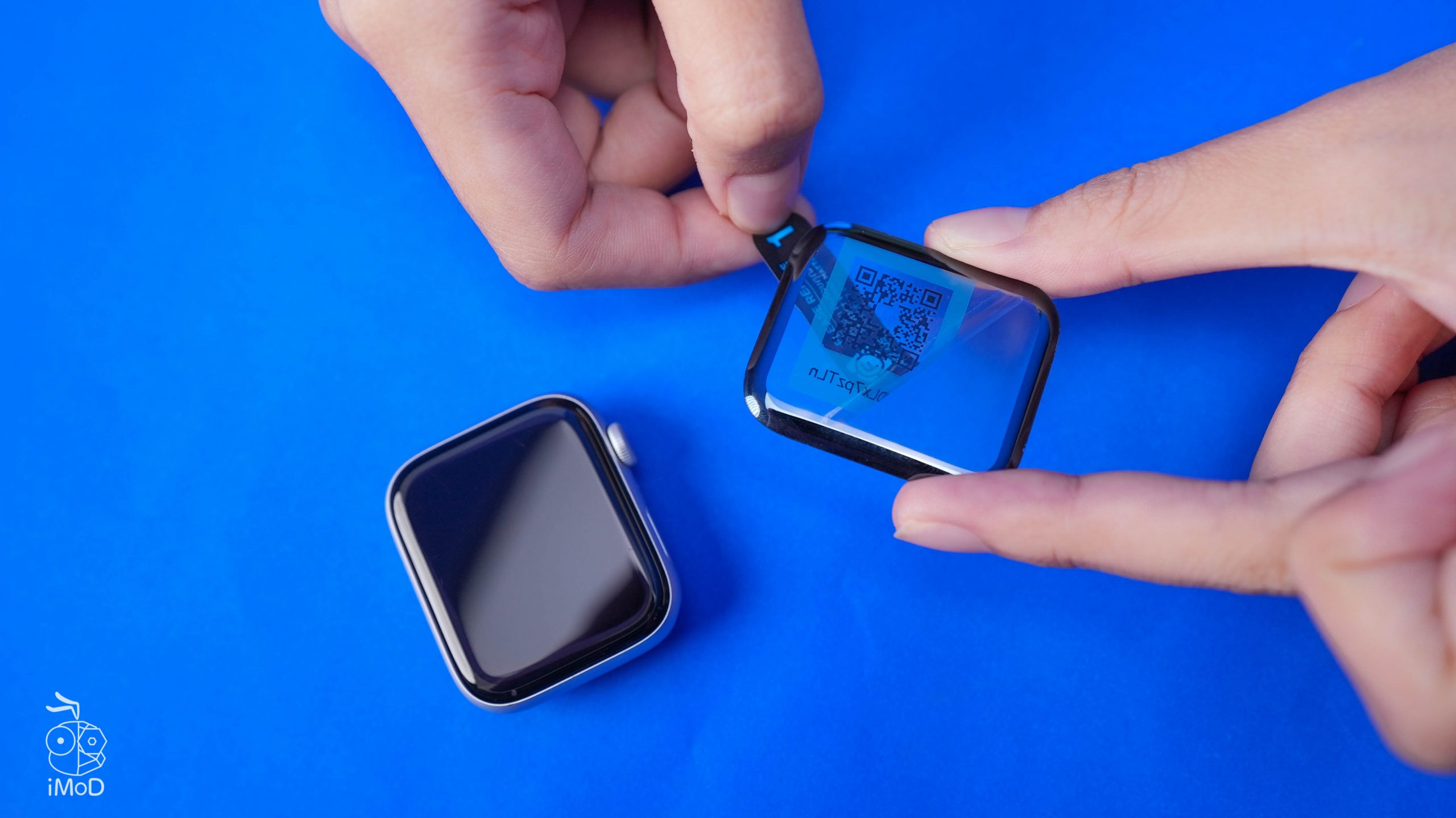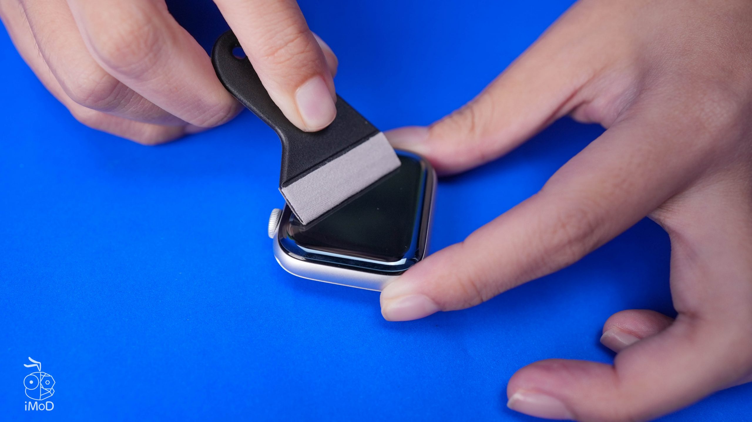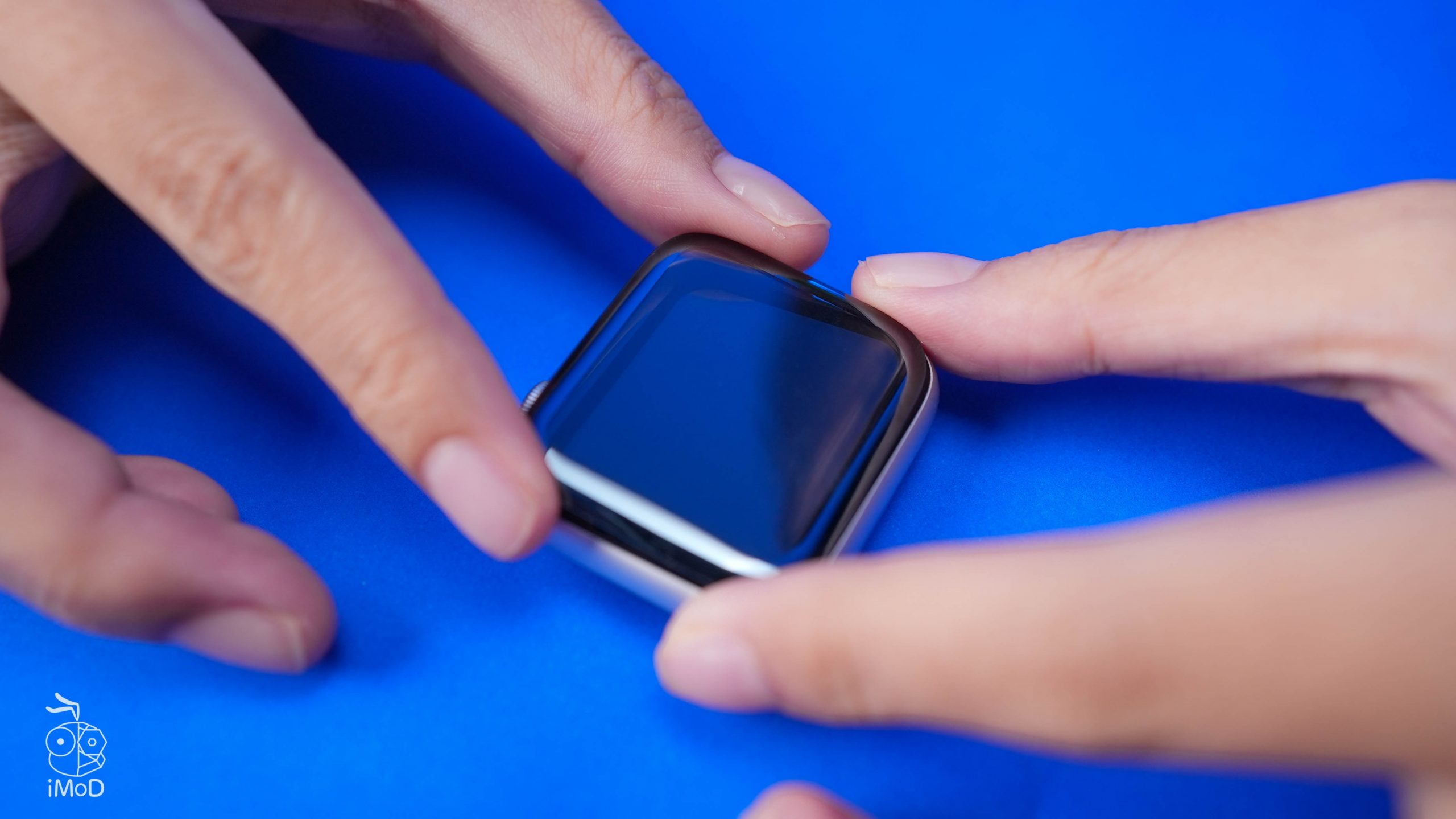 กะระยะของฟิล์มกระจกให้ตรงกับหน้าจอ Apple Watch จากนั้นค่อย ๆ วางฟิล์มกระจกให้แนบกับหน้าจอ