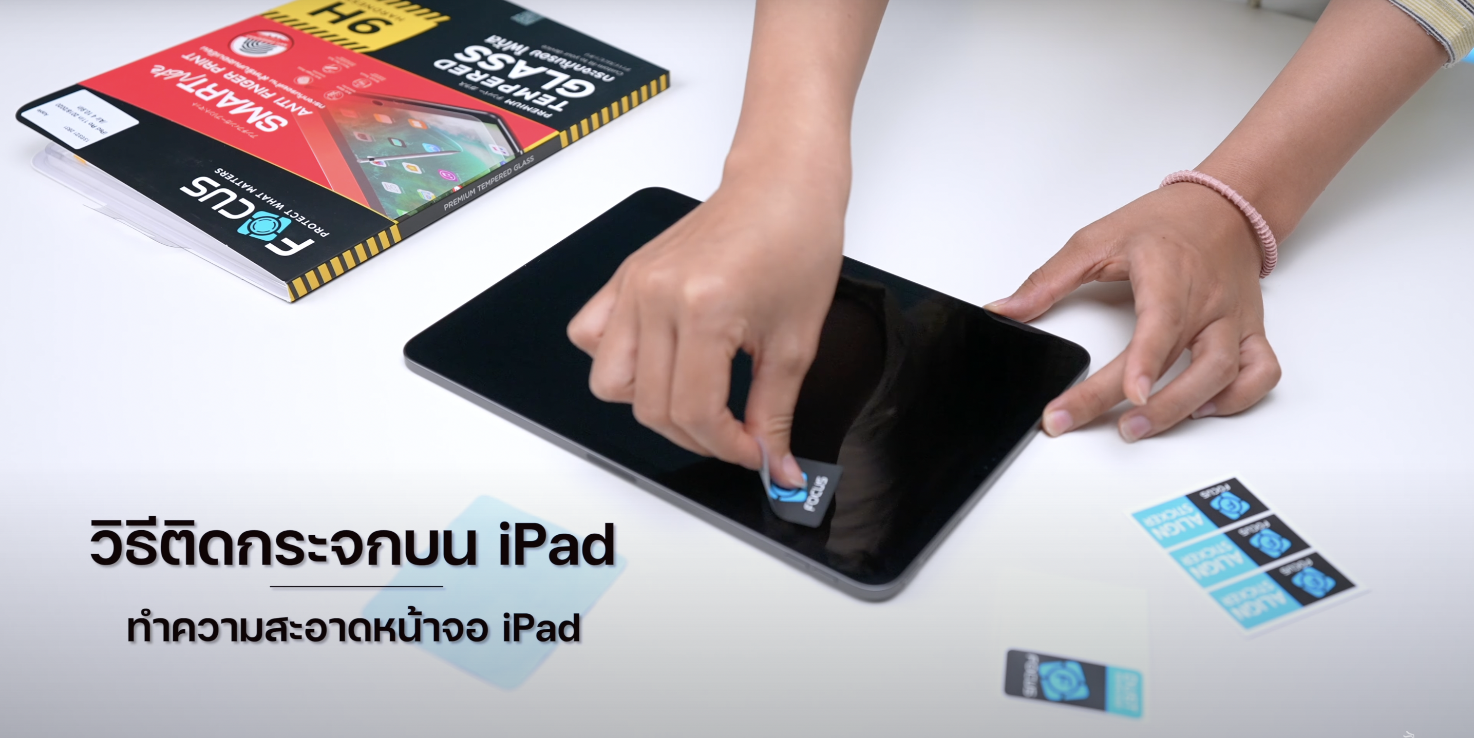 วิธีการติดฟิล์มนั้นสามารถทำได้ง่าย ๆ เลย โดยขั้นตอนแรกให้ทำความสะอาดหน้าจอ iPad ของเราให้สะอาด โดยใช้ผ้าไมโครไฟเบอร์ทำความสะอาด และใช้สติ๊กเกอร์เก็บฝุ่นออกให้หมด