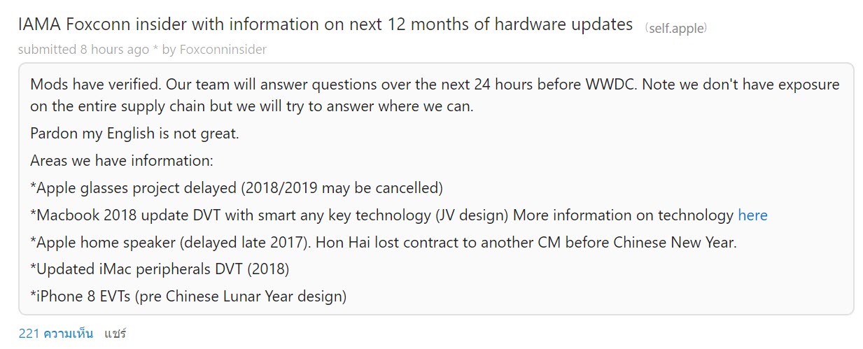 มีการเปิดเผยข้อมูลที่อ้างว่าได้ข้อมูลมาจาก Foxconn โดบผู้ใช้งานชื่อ Foxconninsider ผ่านเว็บไซต์ Reddit โดยในรายละเอียดมีการพูดถึงสินค้าใหม่ของ Apple ที่จะมีการอัปเดตให้เห็นกันหลายรายการ