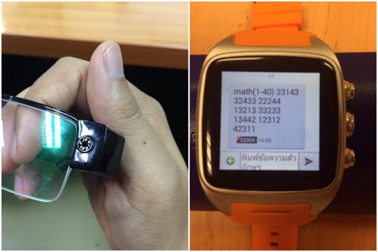 จากภาพเผยเห็นให้ถึง “แว่นตาติดกล้อง” และ “นาฬิกาอัจฉริยะ” โดยอาศัยเทคนิคการถ่ายรูปจากกล้องวิดีโอรูเข็มดังกล่าว ก่อนที่จะออกไปจากห้องสอบก่อนหมดเวลา และใช้วิธีส่งข้อมูลไปยังภายนอกเพื่อถอดข้อสอบและหาคำตอบผ่านโน้ตบุ๊ค จากนั้นจึงส่งเป็นข้อความ SMS เข้ามายังนาฬิกาอัจฉริยะของผู้สอบทั้ง 3 คน (นาฬิกาเป็นชนิดใส่ซิมได้โดยไม่ต้องเชื่อมต่อ Bluetooth)