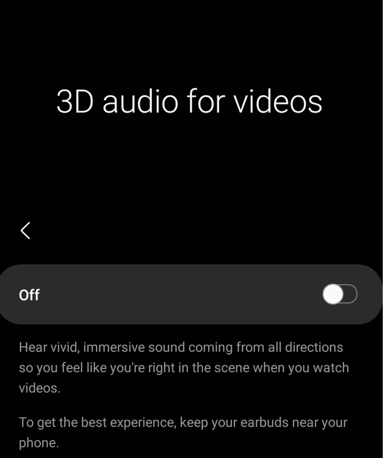 “3d audio for videos” เผยคุณสมบัติว่า รับฟังเสียงที่คมชัดและสมจริงจากรอบทิศทาง ช่วยให้ผู้ใช้รับเสียงได้ถูกทิศทาง เหมือนอยู่ในฉากนั้นระว่างดูวิดีโอ และเพื่อประสบการณ์ที่ดีที่สุดแนะนำให้วางหูฟังไว้ใกล้โทรศัพท์