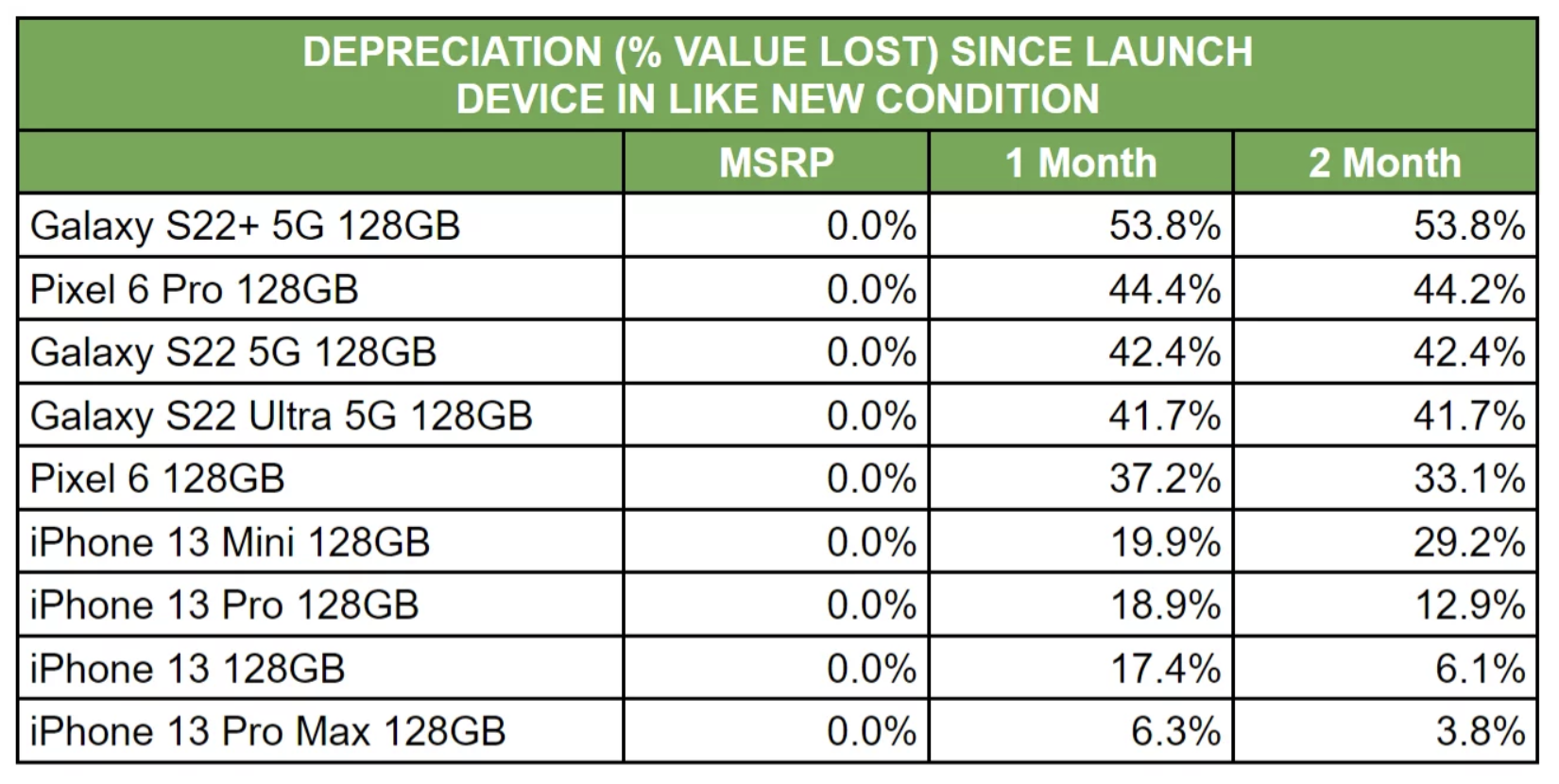 Samsung เปิดตัว Galaxy S22 เมื่อเดือน ก.พ. 2022 ที่ผ่านมา นับเป็น 5 เดือนหลังจาก iPhone 13 เปิดตัว และหลัง Galaxy S22 เปิดขาย 2 เดือนนั้น มูลค่าเครื่องก็ลดลงไปมากถึง 46.8% ซึ่งมากกว่า iPhone 13 ถึง 3 เท่าโดย iPhone 13 มูลค่าเครื่องลดลงไป 16.8% เท่านั้นหลังเปิดขายไป 2 เดือน