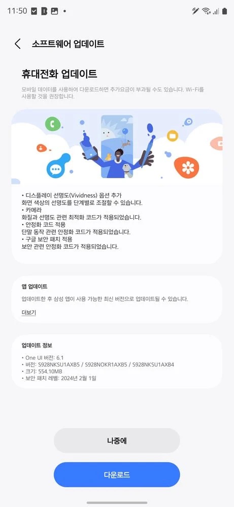 ซัมซุงปล่อยอัปเดตซอฟต์แวร์ใหม่สำหรับ Galaxy S24, Galaxy S24+ และ Galaxy S24 Ultra มาพร้อม firmware เวอร์ชัน S92xNKSU1AXB5 และแพตช์ความปลอดภัย มีพื้นที่เก็บความจำ 554.10MB และแก้ไขช่องโหว่ด้านความปลอดภัย 72 จุดที่พบในซอฟต์แวร์เวอร์ชันก่อนหน้า