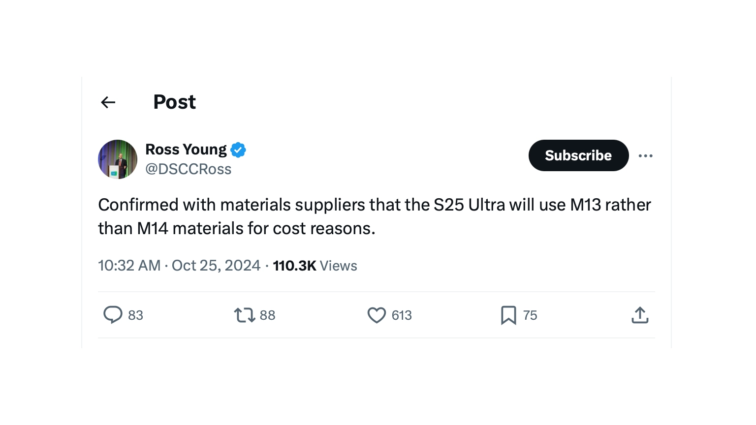 Samsung กำลังพิจารณาลดต้นทุนการพัฒนาสำหรับ Galaxy S25 series โดยจุดสำคัญที่บริษัทตั้งเป้าไว้คือหน้าจอ OLED ของสมาร์ตโฟนรุ่นนี้ โดยคาดว่าทางบริษัทจะใช้แผงจอ OLED ที่ผลิตจากวัสดุอินทรีย์ M13 แทนวัสดุ M14 ที่ใช้ในสมาร์ทโฟนรุ่นล่าสุดของคู่แข่ง เช่น iPhone 16 Pro และ Google Pixel 9 Pro