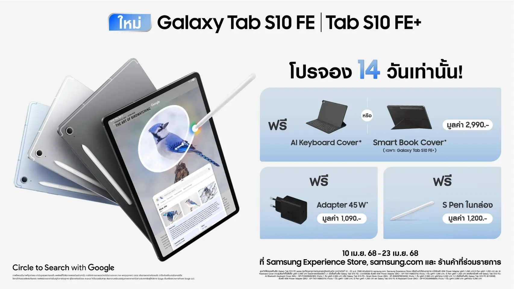 Galaxy Tab S10 FE และTab S10 FE+ เปิดให้จองได้แล้ววันนี้ พร้อมโปรโมชันที่น่าสนใจ เมื่อสั่งจองระหว่างวันที่ 10 – 23 เม.ย. 2568 รับฟรี AI Keyboard Cover, Adapter 45W (ไม่มีสายชาร์จ) และฟรี S Pen ในกล่องและรับส่วนลดสำหรับ Galaxy Bus3, Bud3 Pro และGalaxy Bud FE