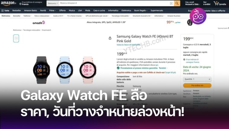 นอกจากนี้ข้อมูลจาก Amazon Italy ยังระบุด้วยว่าการสั่งซื้อล่วงหน้าของ Galaxy Watch FE จะจัดส่งภายในวันที่ 24 มิถุนายน 2024