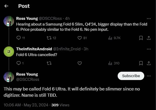 ล่าสุดได้มีรายงานจากผู้ใช้งานทวิตเตอร์ชื่อ Ross Young ซึ่งเป็นคนวงในของโลกอุตสาหกรรม โดย Ross Young ได้รายงานว่า Samsung กำลังพัฒนาสมาร์ทโฟนจอพับรุ่นใหม่ล่าสุดอย่าง Galaxy Z Fold 6 Slim ซึ่งสมาร์ทโฟนรุ่นนี้คาดว่าจะมีหน้าจอที่ใหญ่กว่าและตัวเครื่องที่บางกว่า Galaxy Z Fold 6 รุ่นปกติ แต่จะไม่รองรับ S Pen คาดว่า Galaxy Z Fold 6 Slim จะวางจำหน่ายในไตรมาส 4 ปี 2024