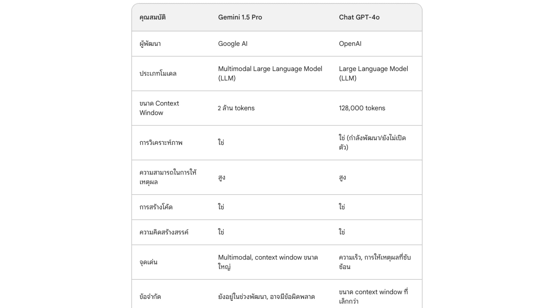 ตารางเปรียบเทียบ Gemini 1.5 Pro vs ChatGPT-4o