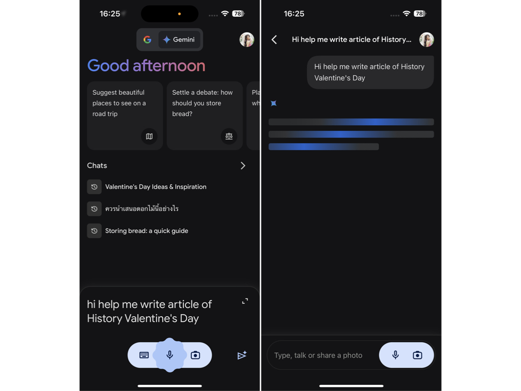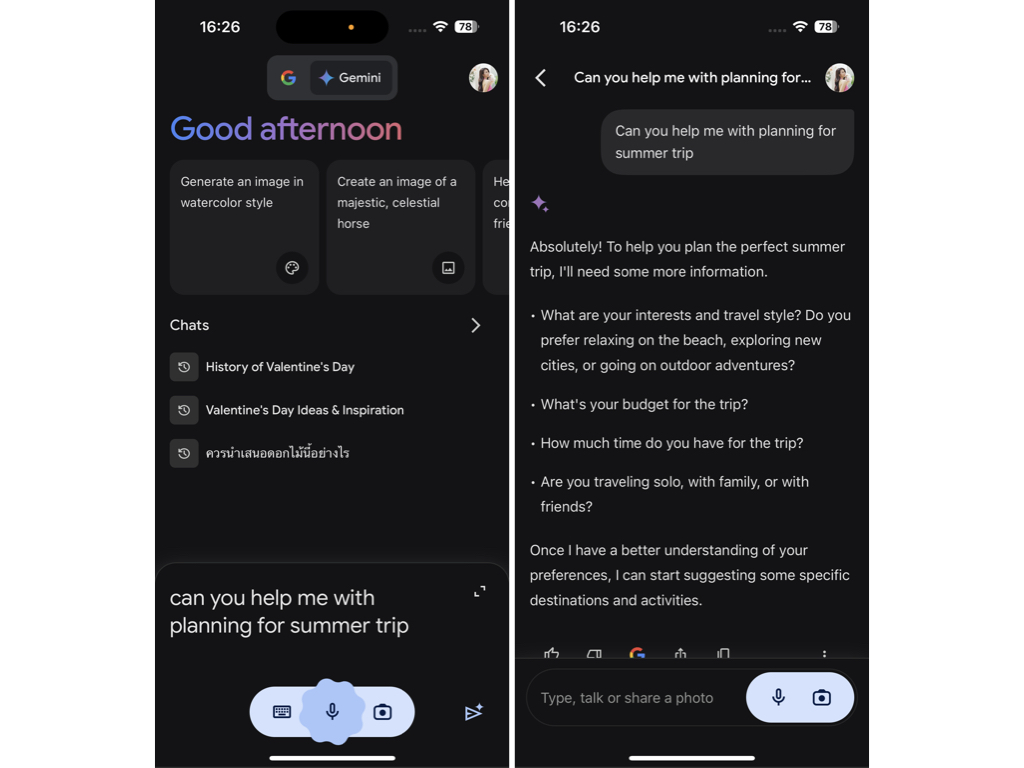 สามารถพิมพ์ถามเป็นภาษาไทยหรือภาษาอังกฤษ, แตะไมค์คุยแชทกับ Gemini (ตอนนี้รองรับแค่ภาษาอังกฤษ) หรือเพิ่มรูปภาพแล้วใช้ Gemini ช่วยทำงานได้เลย